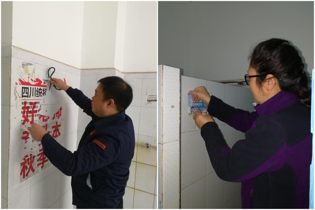 本次厕所清洁美化,由厕所门刷新、小广告清理和入厕文明用语提醒三部分组成。结合南教学楼厕所门板年久掉漆,门上乱写乱画现象严重的实际,数码艺术系党支部全体党员同志,自筹经费购入油漆5桶、承漆盆10只、油漆刷10把,对南教学楼所有厕所门进行了重新刷漆;并针对粘贴在墙体、瓷砖、门板等不同部位的各类宣传小广告,通过手撕、铲刀铲、美工刀刮、剪刀撬等方法,逐个进行了清除。最后为营造一个健康文明的入厕环境,支部精选了多条文明提示用语,分别在小便池、大便池和洗手台等处进行粘贴,用于提醒同学们文明入厕,为厕所文明建设工作营造了良好的文化氛围。