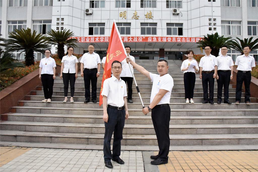 授旗仪式上马芸同志首先宣读了《四川航天职业技术学院关于成立学院应急支援党员突击队的通知》;学院党委书记黄茂才同志向应急支援党员突击队进行了授旗;全体队员面对党旗和队旗进行了庄严宣誓,承诺坚决做到勇挑重担,敢打硬仗,冲锋在前,遵守纪律,一切行动听指挥,自觉践行初心使命,永不退缩。