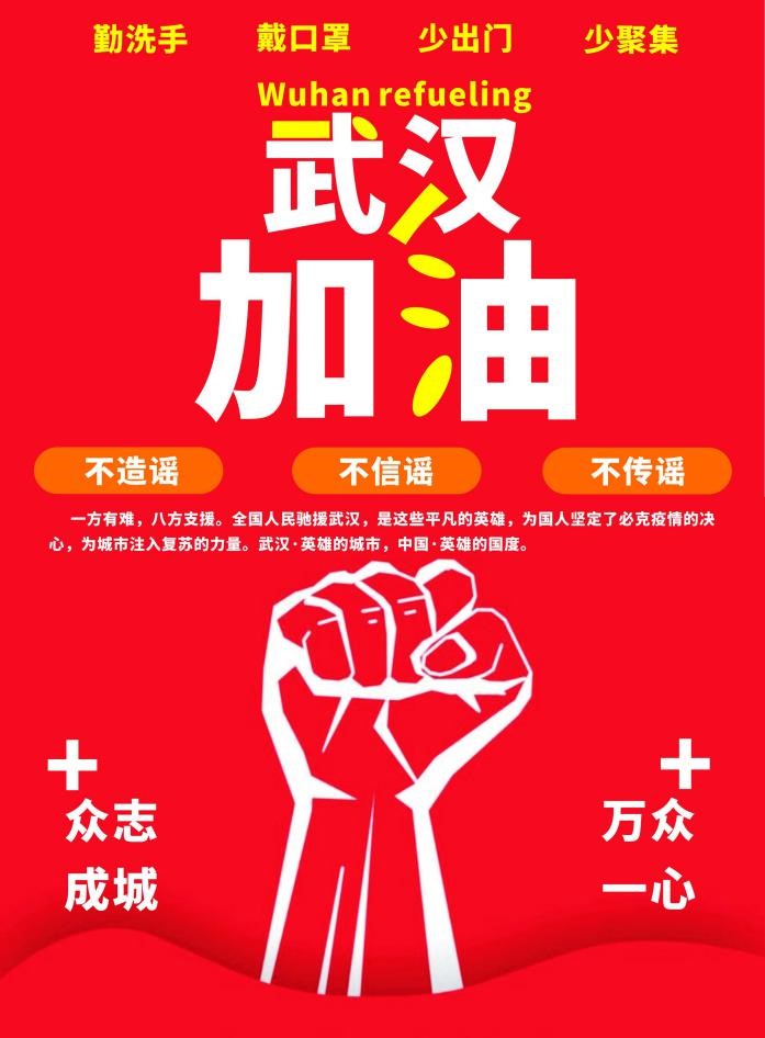 一方有难,八方支援,这八个字,是我们在面对任何灾难时的动力,武汉疫情的爆发,让全国、全社会、各行业都团结一致,所有人都在自己的岗位发挥一己之力,为武汉加油和助力。无数人在这个春节放弃与家人团聚的机会,只为在一线和时间赛跑,与病毒斗争。春天已经来临,我们等待的春暖花开也不远了。面对疫情,我们作为新生力量,虽然不能在一线作出贡献,但我们用我们的力量为疫情作出宣传,让更多人正确认识、了解疫情相关的知识。