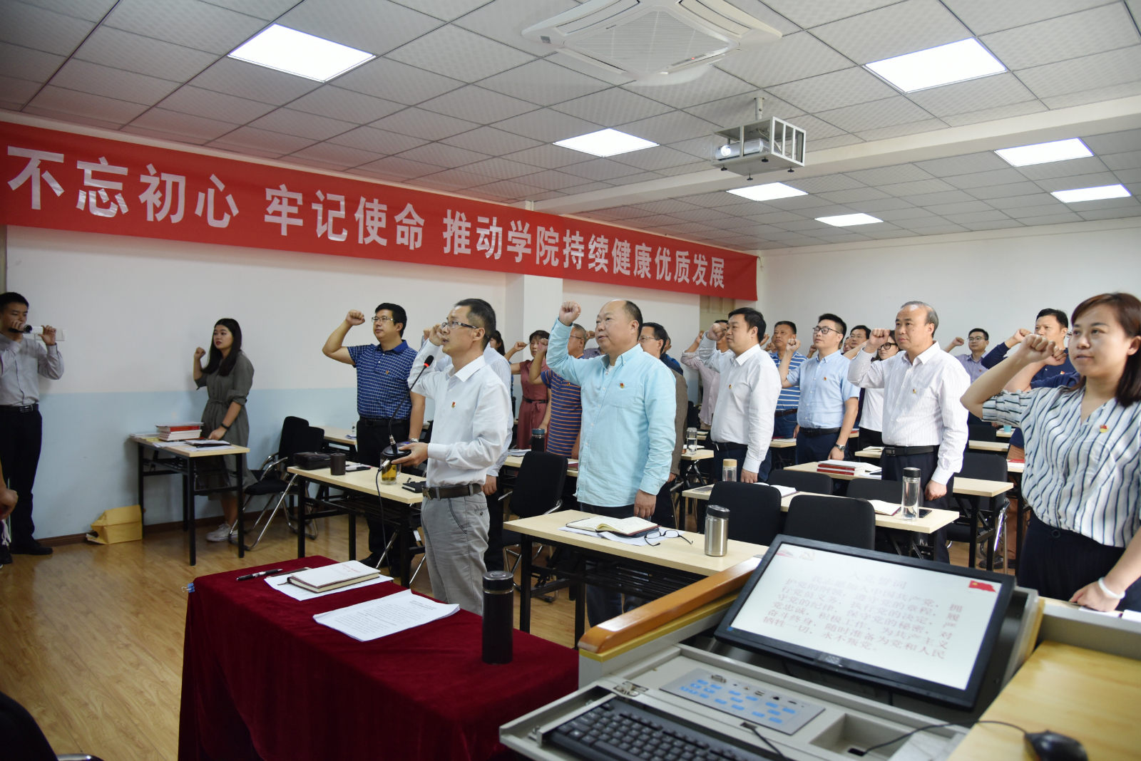 “我志愿加入中国共产党,拥护党的纲领,遵守党的章程……”28日下午学院龙泉校区南楼205教室内,传出一阵庄严洪亮的声音。这可不是新党员入党仪式,这是学院“不忘初心、牢记使命”主题教育党课开讲之前的一个重要仪式。只见教室内党旗招展,在场的各位党员干部右手握拳念诵入党誓词。重温入党誓词后,主题教育党课正式开始。