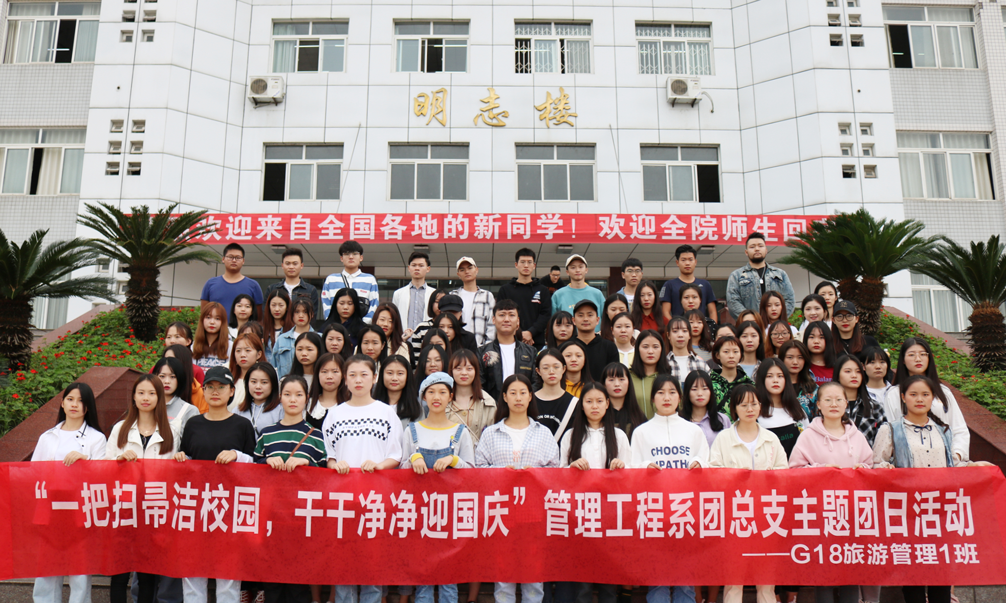 9月20日,管理工程系团总支把团支部建设与志愿服务相结合,组织G18旅游管理1班团支部全体团员青年,开展了以“一把扫帚洁校园 干干净净迎国庆”为主题的团日活动。同学们来到学院广汉校区明志楼,拿起扫帚、钢丝球和小铲子等保洁工具对明知楼内厕所里的“牛皮癣”进行了彻底清理。