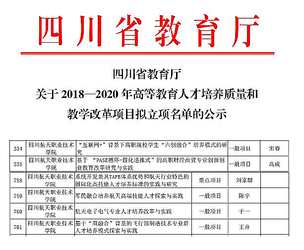 近日四川省教育厅公布了2018-2020年高等教育人才培养质量和教学改革项目立项名单,我校共有6个项目获批立项,其中院长刘家騑主持的《系统开发兼具TAFE体系优势和航天行业特色的国际化高技能人才培养标准的实践与研究》拟为重点项目,副院长陈宇主持的《军民融合培养航天高端技能人才探索与实践》等5个课题拟为一般项目。