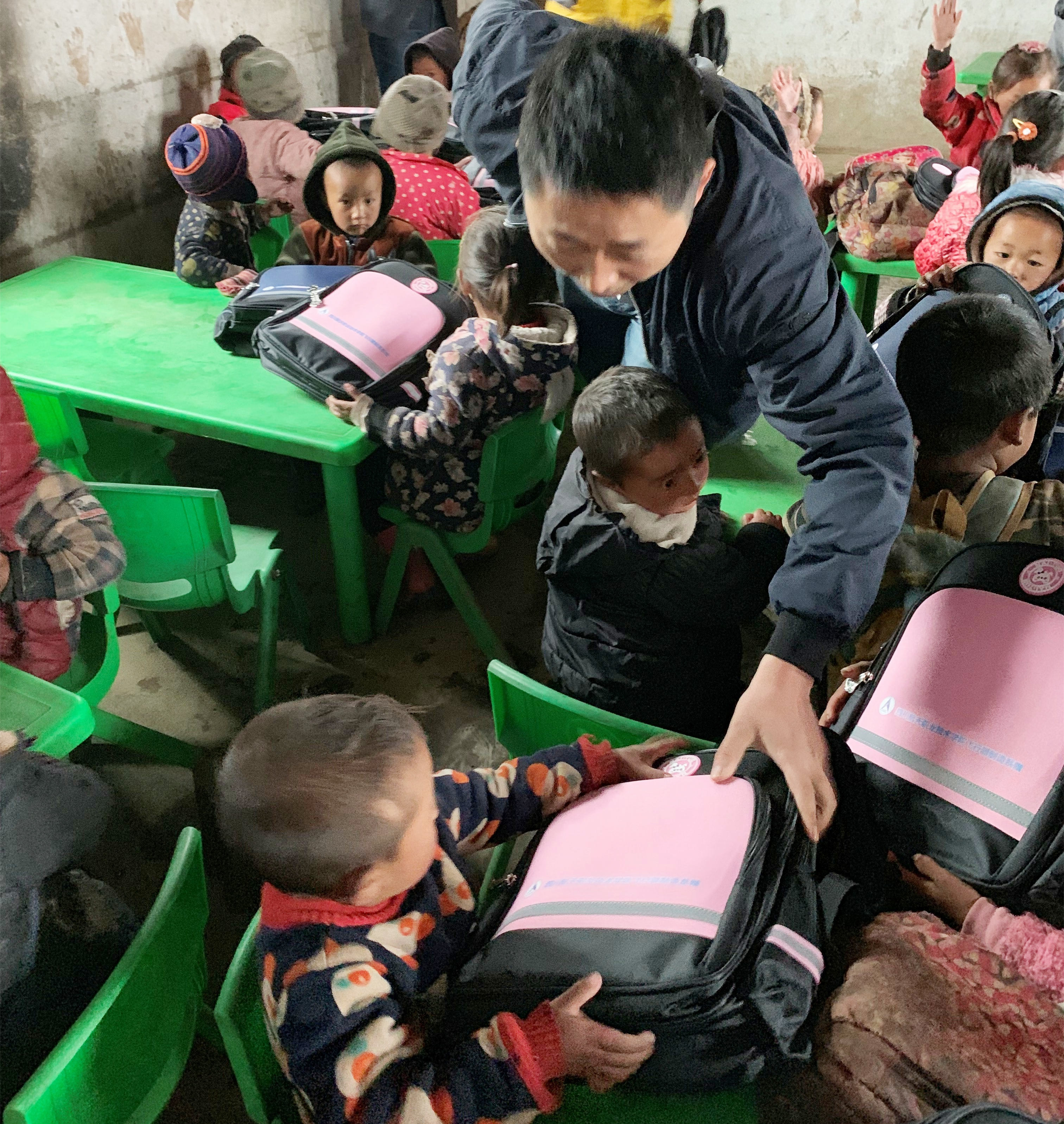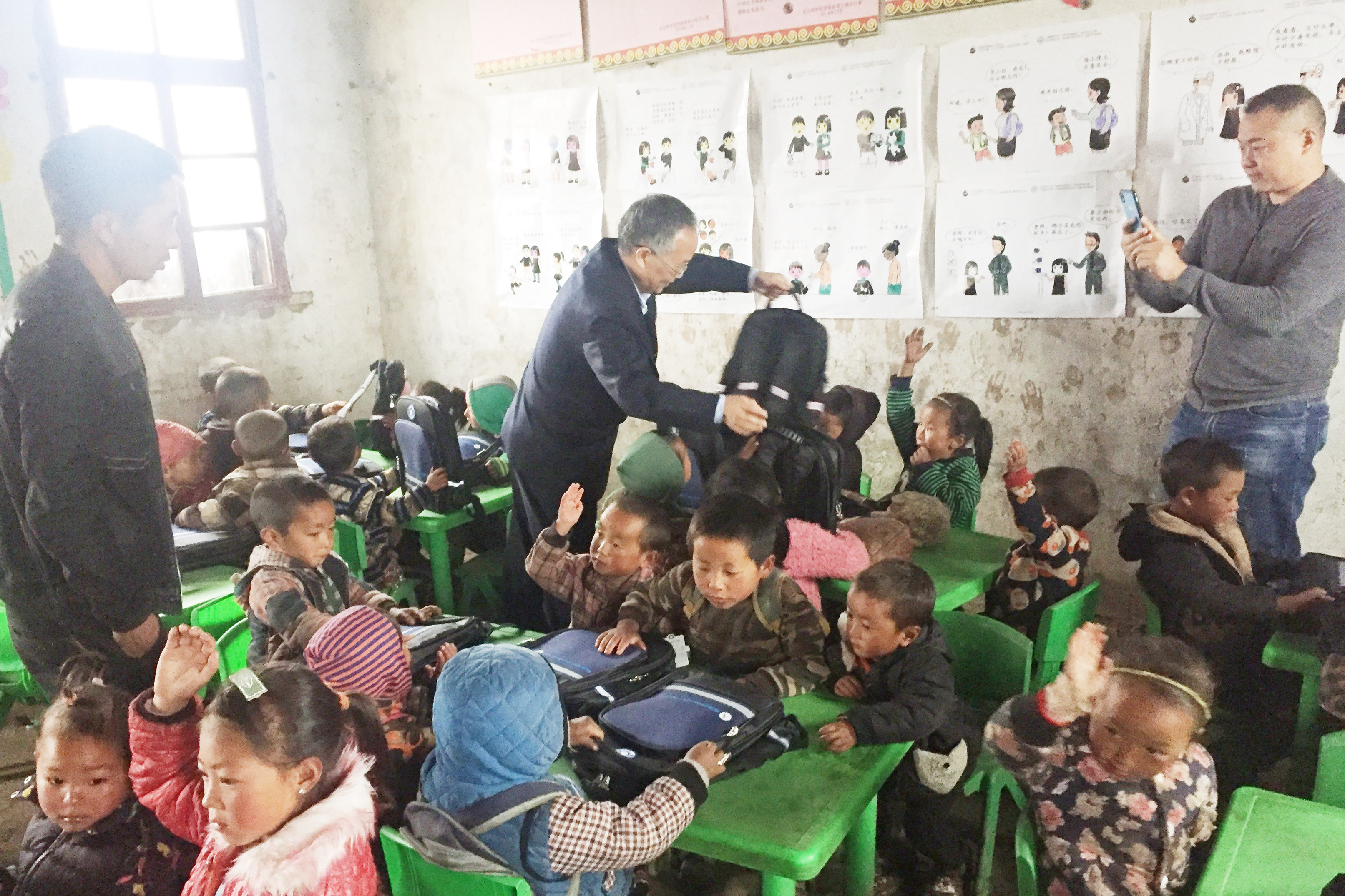 当天一早,胡主任一行冒着小雨沿着村里泥泞的土路来到幼教点。刚一进门,孩子们便齐刷刷的用普通话喊到:“叔叔好!”看着艰苦的环境和可爱的孩子们,在场的同志们无不深受触动。胡文彬与支部委员刘清杰一起将系上师生捐赠的书包、画本、蜡笔一一交到孩子们手中,拿到新书包的一刻,孩子们眼中满是喜悦的光芒。