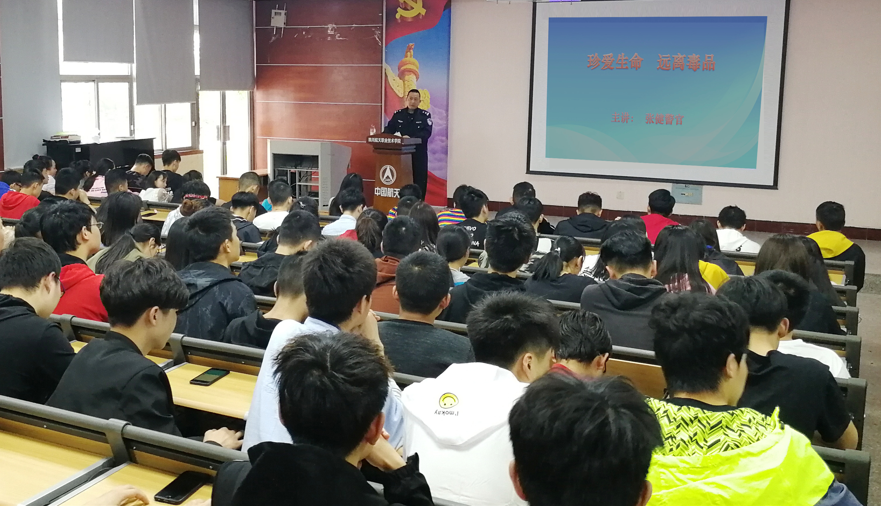 为加强学院禁毒安全管理工作,进一步提升全院师生防毒拒毒能力,4月16日,应学院保卫处邀请,龙泉公安分局北干道派出所张健警官在南教学楼阶梯教室,开展了一堂以“珍爱生命 远离毒品”为主题的禁毒安全专题教育课,学院300多名师生接受了禁毒安全教育。