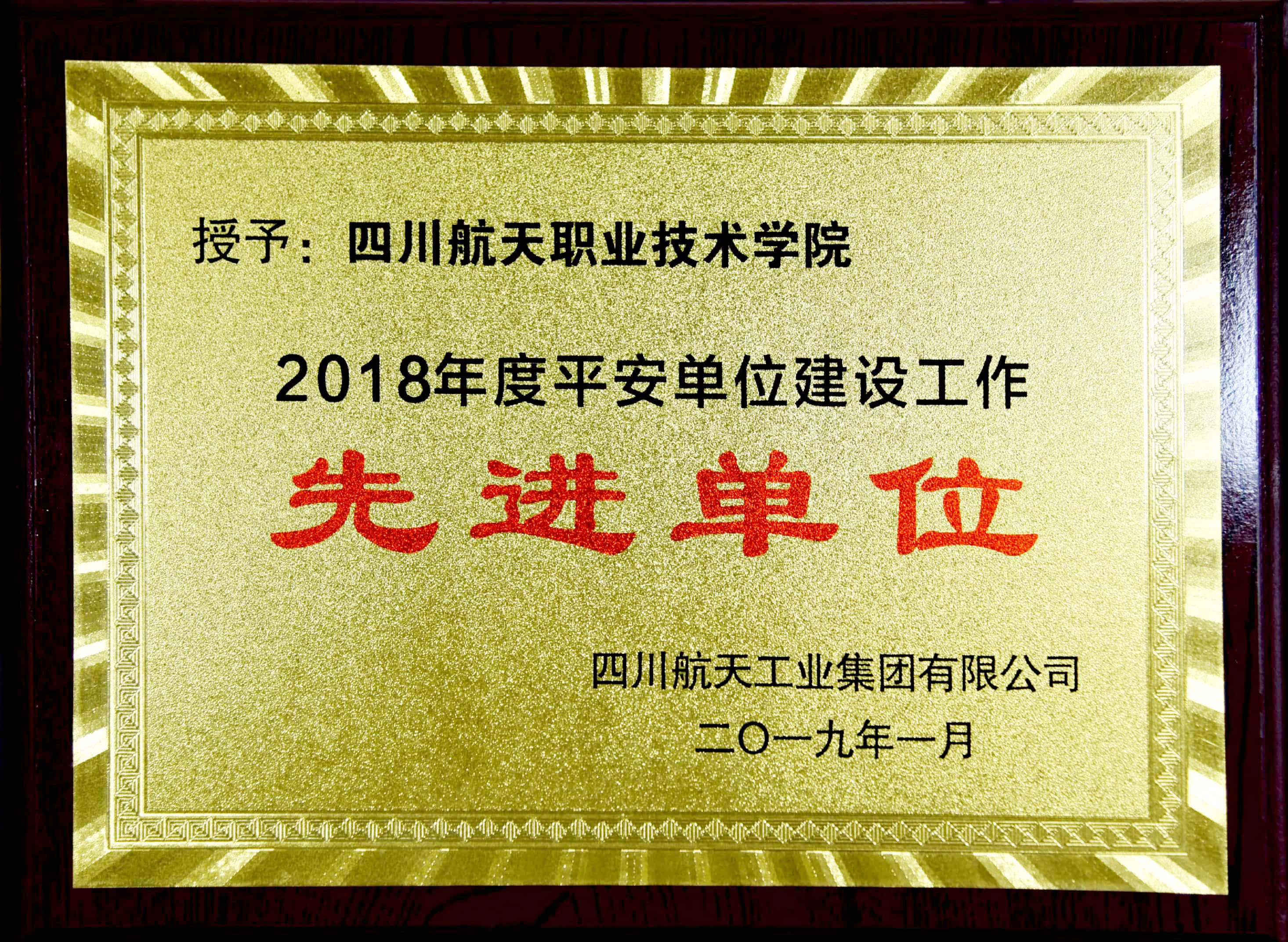 近日,从四川航天集团平安单位建设专项工作会上再传喜讯,四川航天职业技学院喜获四川航天工业集团“2018年度平安单位建设工作先进单位”荣誉称号。