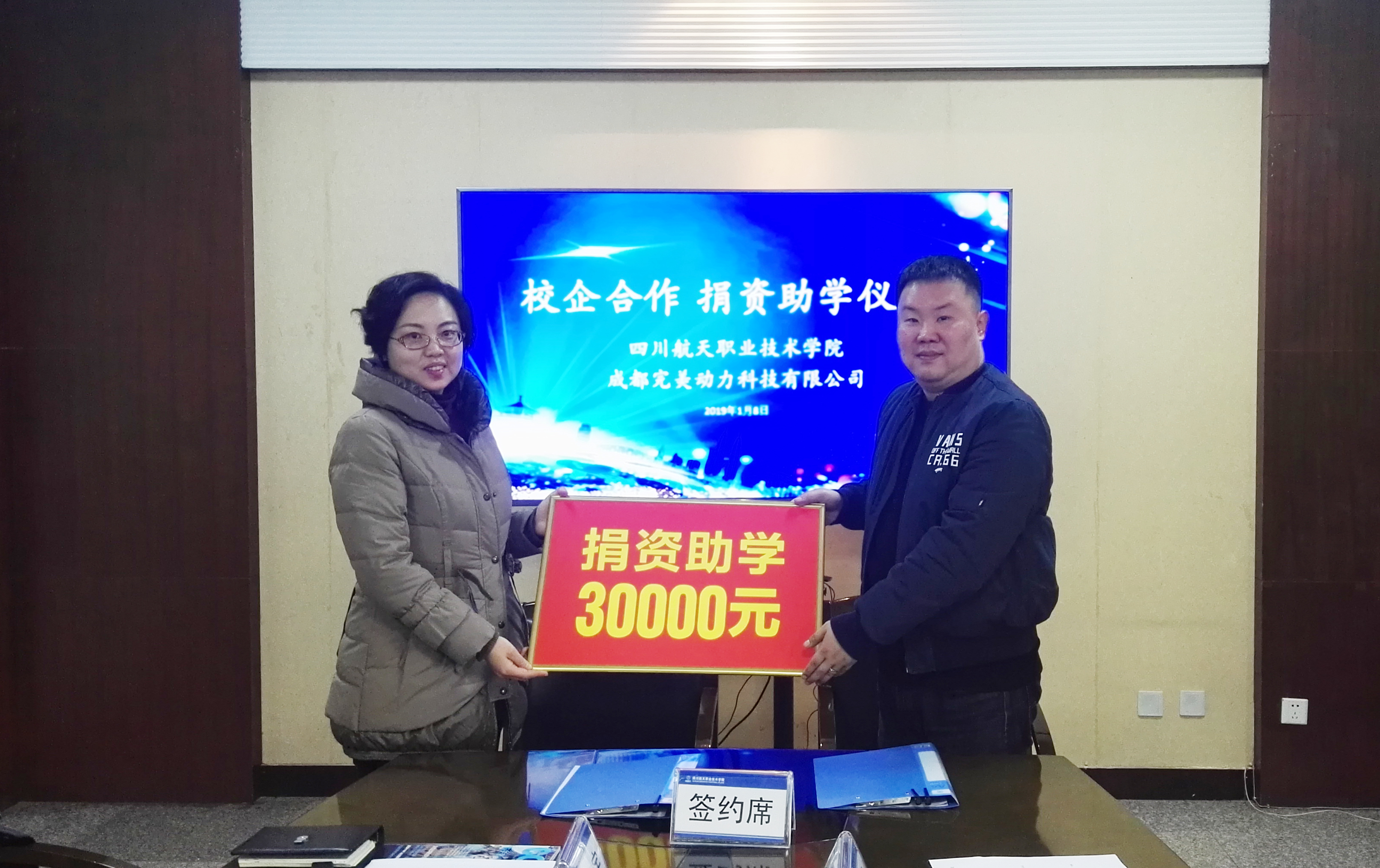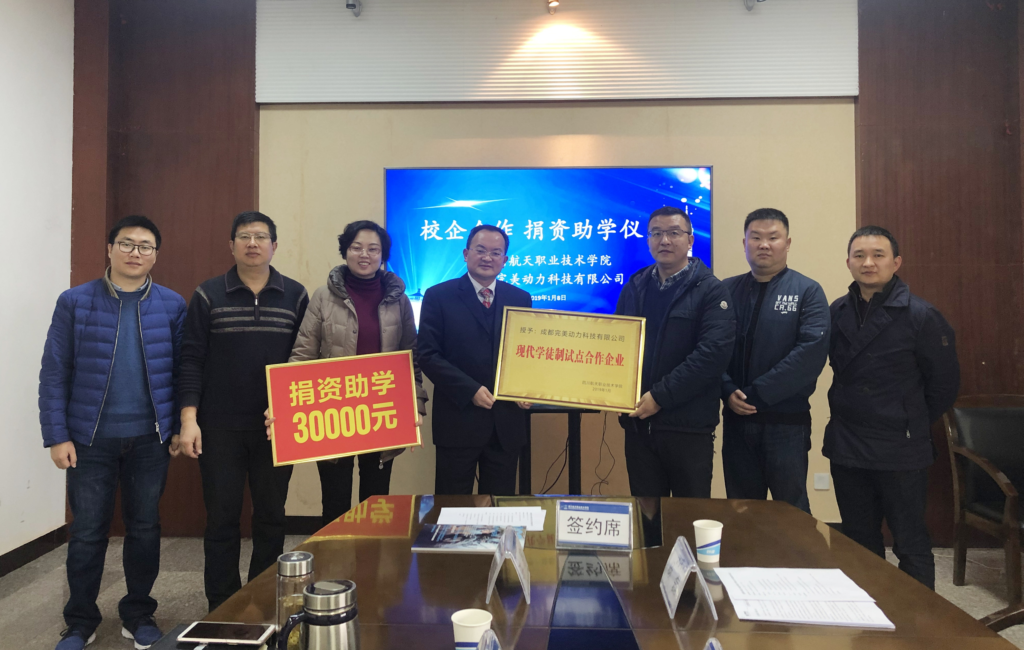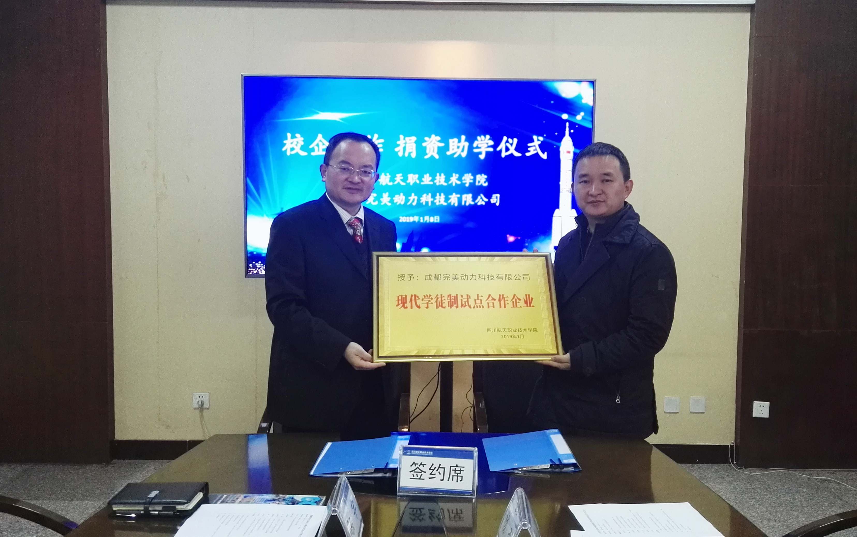 2019年1月8日上午,计算机科学系和成都完美动力科技有限公司在广汉校区致远楼举行了校企合作捐资助学仪式暨现代学徒制试点合作单位授牌仪式,学院院长刘家騑、副院长陈宇参加了会议,会议由学院陈宇副院长主持。