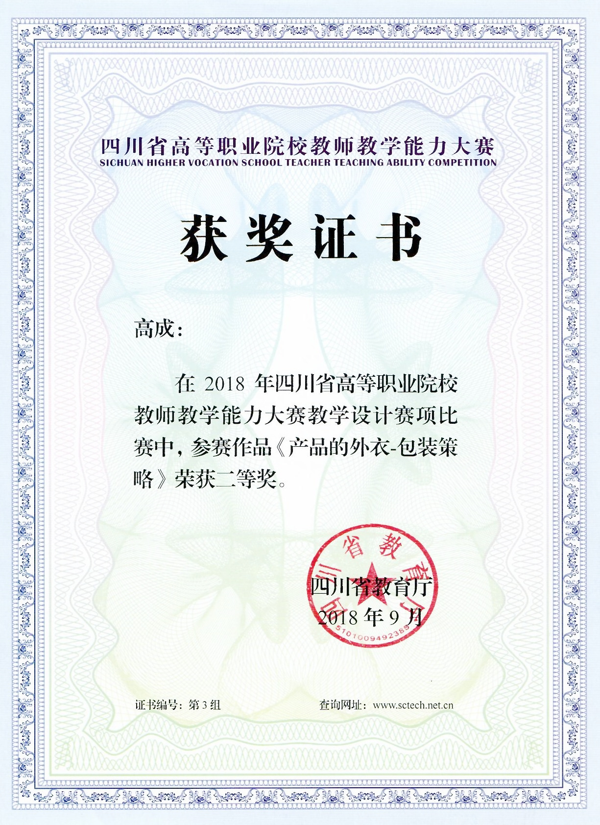 2018年9月,在成都举行的四川省高等职业院校教师教学能力大赛的圆满落幕,本次大赛由教育厅主办,成都航空职业技术学院承办,在以往四川省高等职业院校教师信息化教学大赛的基础上开展延续的目前规格最高的教师类比赛。今年参赛的学校包含全省50多所高校近百个院系,初赛团队和作品达1000多份,复赛600多份作品,竞争相当激烈。我院管理工程系高成老师顺利进入决赛角逐等级奖项,其教学能力大赛作品《产品的外衣-包装策略》获得省级二等奖,是全省一二等奖中唯一以个人身份参赛的老师。