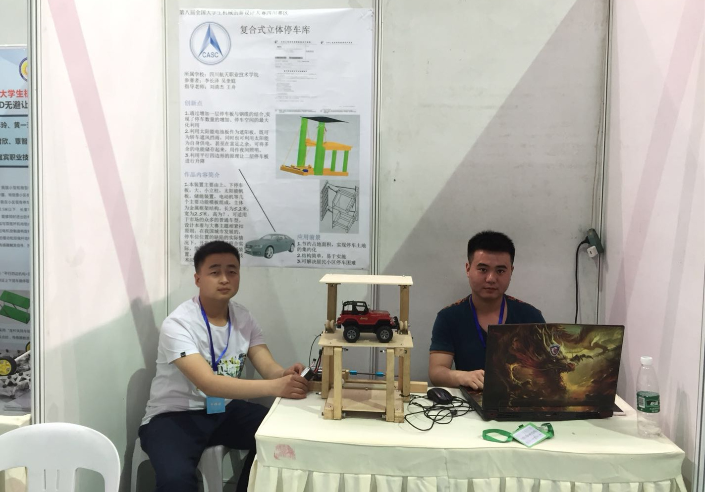 自2017年3月1日收到全国大学生机械创新设计大赛组委会竞赛通知文件以来,系部领导高度重视,系主任胡文彬亲自召开科研会商讨组队方案,挑选参赛队员,制定了由各个专业负责人、专业骨干教师及学生组队的比赛计划。围绕第八届全国大学生机械创新设计大赛(2018年)“关注民生、美好家园”的主题,针对解决城市小区中家庭用车停车难问题的小型停车机械装置的设计与制作;辅助人工采摘包括苹果、柑桔、草莓等10种水果的小型机械装置或工具的设计与制作两方面的内容,最终确定了以王舟、刘清杰为指导老师的设计团队。经过近一年半的不懈努力,设计团队在参赛前完成了复合式立体停车库的设计说明书和设计图纸,并制作了等比例缩放的实物模型。在比赛中,与四川大学、西南交通大学、电子科技大学等985、211名校的队伍同场竞技,最终成绩在本组专科院校中排名第一。