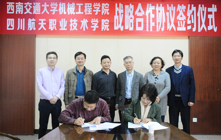 陈宇副院长与西南交通大学机械工程学院党委书记战凤代表双方签订战略合作议。按照协议,两校将在本专科应用型人才培养、学历继续教育领域,以及专业设置、课程建设、专业建设、教学管理、师资队伍建设、产学研结合等方面加强资源共享、项目合作、信息交流和相互学习。同时,西南交通大学机械工程学院在四川航天职业技术学院设立教学实习基地。