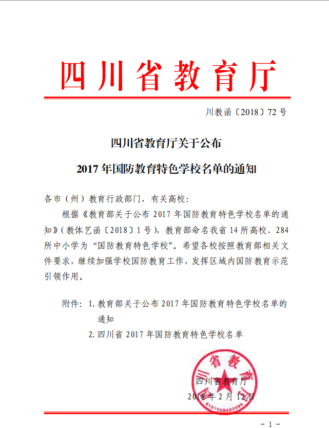 3月3日,根据《四川省教育厅关于公布2017年国防教育特色学校名单的通知》(川教函〔2018〕72号),四川航天职业技术学院(以下简称学院)成为教育部指定的“国防教育特色学校”,在川高校仅有14所获此称号。