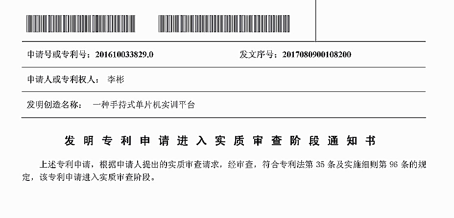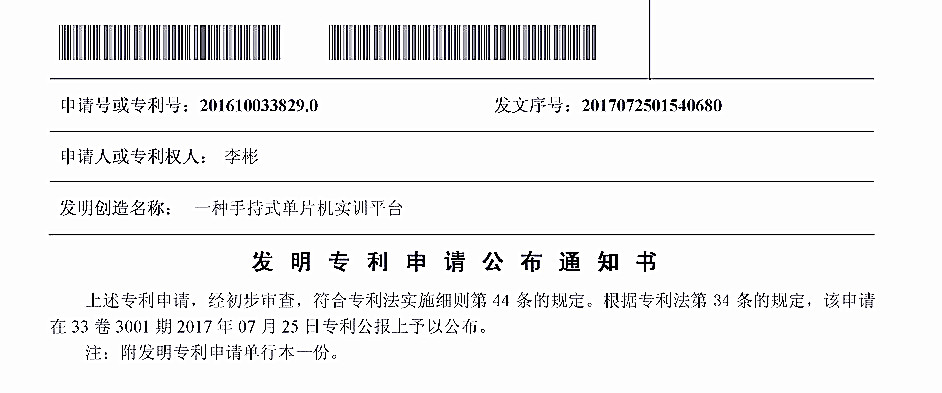近日,四川航天职业技术学院电子工程系李彬、宋睿等教师团队,注重科技研发,将研究发明与教学紧密结合。一种“手持式单片机实训平台”发明专利成功的在专利公报上公布,并进入实质审查阶段,该专利现已应用于学院级科研课题建设立项及多个电子类专业班级的理实一体化教学中,并且效果显著。例如:以前的单片机课程是纯理论学习,要把理论知识转化成实践操作还需要相当长的时间,要单片机通过各种协议和外围模块、电路开发出产品雏形难度就更大。而新型平台将理论学习、工程实践的典型应用电路、典型通讯协议结合在一起。可以在很短的时间内掌握各个环节内容。目前,在使用了该新型平台教学的班级学生中,超过一半的学生能够通过单片机编程达到想要的功能(产品雏形);以前能够参加校外科技活动的学生基本上来自电子科技协会,而根据目前的教学情况来看,班级部分学生的单片机应用能力已经超过电子科技协会成员。