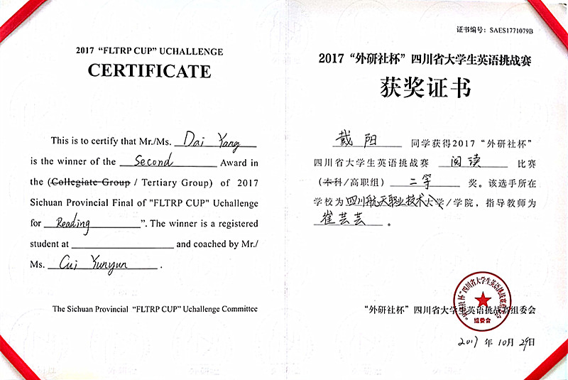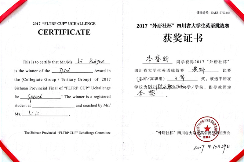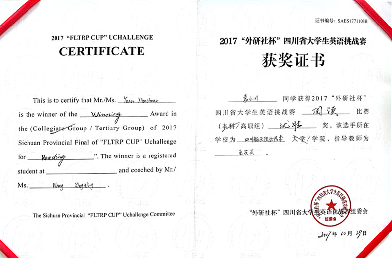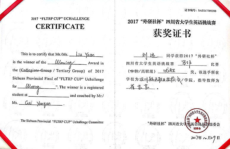 10月28日29日,2017年“外研社杯”全国大学生英语挑战赛(UChallenge)四川赛区竞赛(四川省大学生英语演讲大赛、英语写作大赛、英语阅读大赛)在四川师范大学成龙校区拉开了帷幕。我院五名学生在29日举行的(高职高专组)演讲、写作、阅读比赛中共获得二等奖两名、三等奖一名、优秀奖两名的好成绩。
