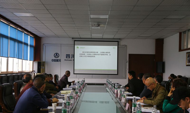 新平镇金维喜镇长首先介绍了镇内行业企业和特色小镇的建设情况。随后详细展示了新平镇科技教育型小镇建设方案,以三星堆文化遗产为基底、以科技教育转型发展为动力、以川西田园风光为依托打造三星堆时空小镇。
