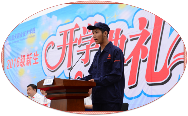 大家好,我是汽车检测与维修技术专业的彭泓轶,很荣幸能代表全体大一新生在这里发言,在此我谨代表全体大一新生向在军训期间一直悉心教导我们的各位领导、教官和老师们表示衷心的感谢! 时间总是转瞬即逝,昨日我们还在考场为自己的理想挑灯夜战,今日已站在这里,与全国各地为梦想而来的同学们共聚四川航天职业技术学院。我们一定会做到:尽快适应新的大学生活,树立远大的奋斗目标;共同营造团结友爱的氛围;尊师肯学,持之以恒。同学们,让我们以“吹尽狂沙始到金”的不屈毅力和“直挂云帆济沧海”的傲然勇气,迎接人生中的风风雨雨吧,记住“宝剑锋从磨砺出,梅花香自苦寒来”的古训,坚信一分耕耘,一份收获。同学们,让我们一起奋发努力、勇往直前吧,直到迎来收获的那一天。老师们,相信我们一定能在航天职院这个大舞台找到新的自我,谱写属于我们自己的美好篇章!
