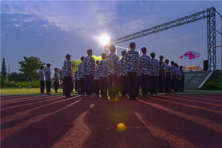 9月8日晚,大一新生和教官们在操场上进行了联谊晚会,3000多名大一新生们穿着整齐的航天蓝迷彩服席地而坐。