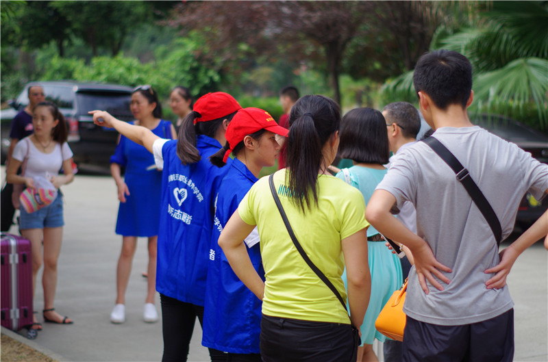 人群里的那“一点红”!每个报到流程点都可以看到我们的学生志愿者,他们头戴小红帽,每个在指定的地点,随时准备着为初来乍到的学弟学妹们排忧解难。