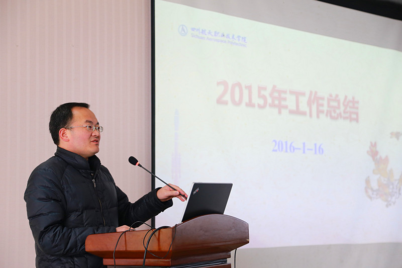 会上,刘家騑院长做了学院2015年工作总结。他说,2015年,经过全体教职工辛勤努力,扎实工作,学院各项工作任务和指标稳步推进,“十二五”各项建设圆满收官,取得了物质文明建设和精神文明建设双丰收:一是超额完成招生目标任务,大专、成人大专、中职类共招生5127人。二是圆满实现了学生就业创业,截止目前,2015届毕业生就业工作已顺利完成,毕业生总数6158人,就业率已达97.02%。三是优质高效地完成了重大项目建设,顺利通过了国家级高技能人才培训基地项目验收、德阳市高技能人才培训基地项目验收、四川航天技师学院专家评审,成功申报了四川省教育体制改革试点项目,获得德阳市国家高等职业教育综合改革试验区专项建设项目,完成图书馆、文体综合楼和男生1#公寓验收,稳步推进了省级重点专业建设。四是教师队伍能力建设水平显著提升,引进了机械、汽车、软件、自动化等专业教师,其中2015届毕业生硕士11名,培养在职博士3名,2016届毕业生硕士9名;增加教师培训机会,鼓励支持教职工参加职称评审,新评讲师12人、副教授9人、教授4人;我院教师参加各项比赛喜报不断,指导学生参加各类技能竞赛屡获佳绩,荣获国家级一等奖1项、省级奖项7项、中国航天技术能手1人。五是继续深化了内涵建设,加强了专业课程建设和中专大专本科教育衔接,注重了教师科研能力的培养,提升了学院办学软实力。六是不断开拓交流与合作,对外办学实现新突破,中澳合作数控技术专业新项目已招生开课;在巩固现有合作办学项目的同时,新建了亚洲市场,与韩国庆星大学签订了合作协议。七是狠抓安全稳定平安校园建设,进一步完善了校园条件,进行了安全治安整治,确保了后勤服务质量和校园平安。八是全面完成了目标任务,节能降耗控制了成本,大力开展了对外培训,超额完成了上级部门下达的经营考核目标。九是党群工作保障有力,学院党委扎实开展了“三严三实”专题教育,举办了学院50周年校庆活动,开展了职工趣味运动会、青年教师联谊会、离退休职工重阳节活动、毕业生毕业教育活动及各类丰富多彩的学生社团文体活动,营造了学院团结和谐奋发向上的浓厚氛围。