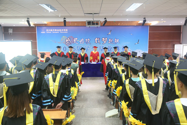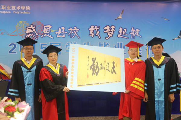 6月27日,学院在龙泉校区隆重举行2015届学生毕业典礼。学校领导、各系部领导、教师代表及学生家长代表们与2015届毕业生共同见证了这一激动又令人难忘的时刻,为同学们的三年大学生活画上了完满的句号。 教师代表邹平老师、学生代表严旭同学分别在会上发言。教师代表邹平老师在会上代表所有教师向勤奋三载,圆满完成学业的同学们表示祝贺,同时也祝愿同学们在人生的大舞台上秀出自己的风采,铸造辉煌的未来。毕业生代表严旭同学代表全体毕业生向为同学们的成长倾注了心血和汗水的领导和老师表示感谢,也希望全体毕业生发扬航天精神,把毕业当作人生旅程的新起点,抱着积极向上的态度,克服一切困难,以优异的工作成绩回报社会及所有关心他们的人。 今年毕业典礼最感人的环节是学生向家长献花,“谁言寸草心,报得三春晖”,他们向父母表达了二十几年的养育之恩,家长们听到孩子真情流露的话语,情不自禁地流下了感动的泪水。毕业典礼到了最高潮,全体毕业生宣读毕业誓词。最后,全体毕业生共奏歌曲《真心英雄》,2015届毕业典礼圆满结束。