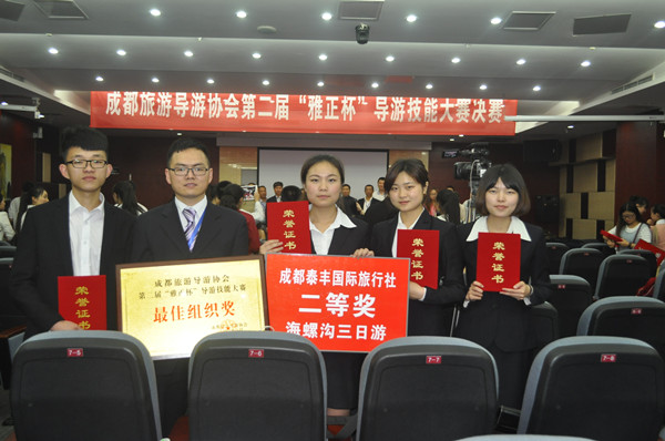 4月26日,应成都旅游导游协会邀请,学院管理工程系G13旅游管理班4名学生在范宗建老师的带领下参加了“雅正杯”成都旅游导游协会第二届导游技能大赛。大赛由成都旅游导游协会主办,雅正教育咨询有限公司承办,省内28所高等院校,共计107名选手参赛。 据悉,本次导游大赛内容涵盖导游专业的核心能力要求,涉及旅游管理及其它旅游类相关专业主要岗位核心职业能力要求,突出强调导游带团综合职业能力。大赛赛程分为景点讲解、知识问答和才艺展示三个环节,学院4名选手过关斩将,分别取得二等奖1项、三等奖2项、优秀奖1项的好成绩,范老师获“最佳指导教师”奖。由于成绩突出,学院还被组委会授予“最佳组织奖”。 本次导游技能大赛,在业内和学院之间都具有一定影响力,通过参赛,锻炼了学生的综合技能。学生的获奖,也展示了学院旅游管理专业建设的成果,为学院提升了社会美誉度。