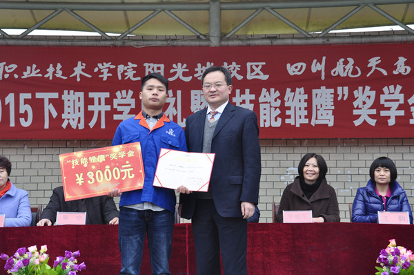3月10日四川航天高级技工学校春季开学典礼暨“技能雏鹰”奖学金颁奖仪式在阳光城校区隆重举行。航天高级技工学校校长刘家騑、副校长陈宇、片区校长高棋出席本次颁奖仪式。校长刘家騑亲自为汽车专业学生彭振川颁发 “技能雏鹰”奖学金证书及3000元奖金。彭振川同学表现优秀,专业基础知识扎实,多次代表学校参加成都市、龙泉驿区技能比赛获奖,能获此殊荣当之无愧。