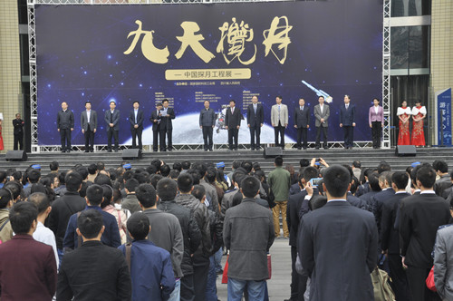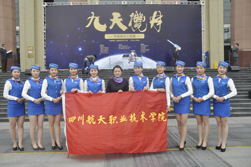 11月4日,由国家国防科技工业局和省政府主办的“九天揽月——中国探月工程展”(成都站),在四川科技馆启幕。 本次展览共展出20多组实物模型,包括嫦娥三号的着陆器、“玉兔号”月球车、长征火箭、人造卫星、模拟发射场和遥控月球车,以及特别制作的互动展品。作为探月工程实施10年来首次在内地举办的主题展览活动,探月工程展首站选择四川,向公众开放至13日,之后将在全国巡展。此前,展览分别于7月和9月,在香港和澳门举办,吸引超过30万港澳民众参观。 学院五十余名师生作为航天企业代表参加了此次开幕式。来自学院的十位优秀的学生承担了开幕式礼仪和义务讲解员的工作。时间短任务紧,这些女孩子仅用了两天时间就熟悉和牢记了长达十多页的讲解词,并且通过网络和书籍对陈列内容进行延伸和补充。她们优雅的气质和精湛的讲解得到了参观者的一致好评。