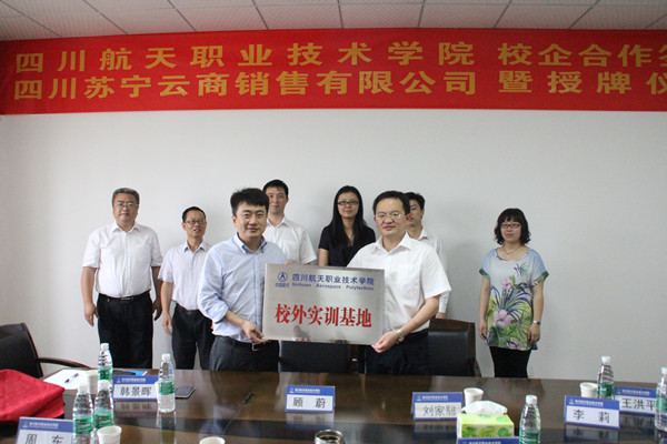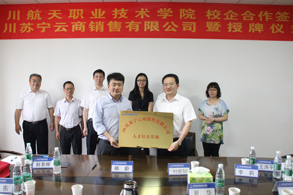 签约仪式上,学院刘家騑院长首先向来宾表示热烈欢迎,对双方一年多来的合作给予了高度评价。四川苏宁云商销售有限公司顾蔚总经理对我院实习学生的表现也给予了肯定和表扬。他表示,学院高度重视培养学生的动手实践能力,培养出来的学生不仅有深厚扎实的专业知识,实际操作能力更是非常熟练优秀,并且特别能够吃苦耐劳,虚心学习,公司将全力支持校企合作,联合培养对社会有用的应用型人才。双方就进一步合作达成一致,签订了合作办学协议,并互相授牌。刘家騑院长为四川苏宁云商销售有限公司授予了“四川航天职业技术学院实训教学基地”称号、顾蔚总经理为学院授予了“四川苏宁云商销售有限公司人才培养基地”称号。