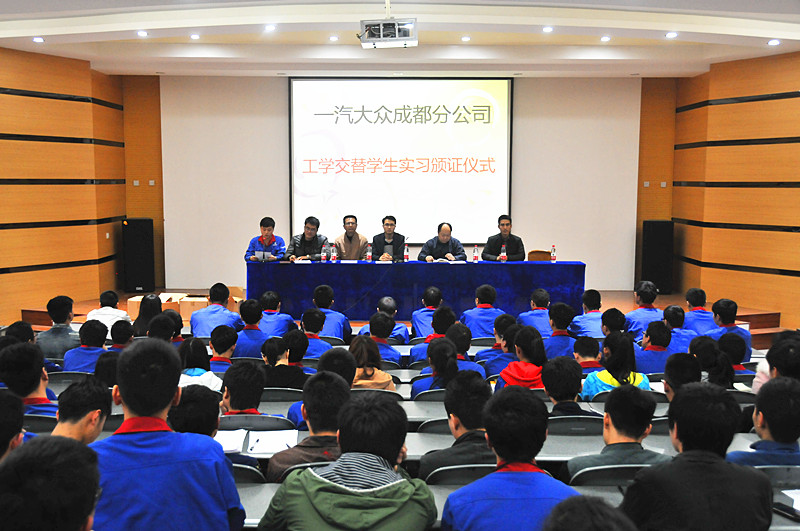 近日,学院隆重召开一汽大众汽车有限公司成都分公司为工学交替学生颁发实习证书的仪式。学院领导以及一汽大众成都人事中心领导参加仪式。