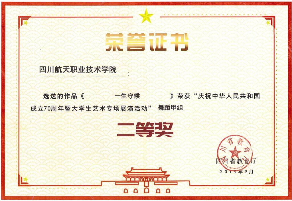 为隆重庆祝中华人民共和国成立70周年,由四川省教育厅主办的大学生艺术专场展演活动在西华大学隆重举行。此前,在舞蹈作品征集评选中,学院报送的原创混合群舞作品《一生守候》荣获四川省舞蹈甲组二等奖。
