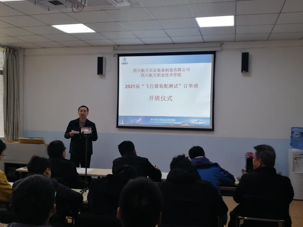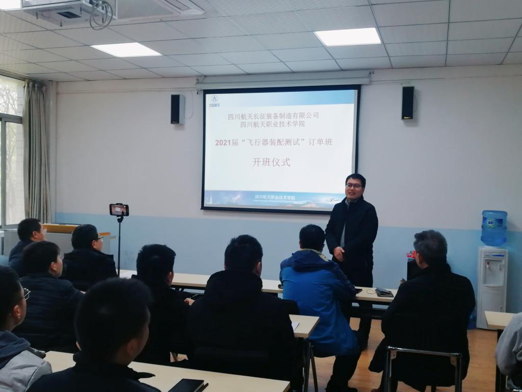 12月1日,四川航天职业技术学院与四川航天长征装备制造有限公司“飞行器装配测试”订单班开班仪式在我校龙泉校区如期举行,正式启动校企合作现代学徒制人才订单培养模式,此次订单班有179名报名同学,经过层层选拔,最终确定32位学员,在接下来的2个月时间里学员们将按照校企联合制定的课程进行培训学习,并接受企业考核。