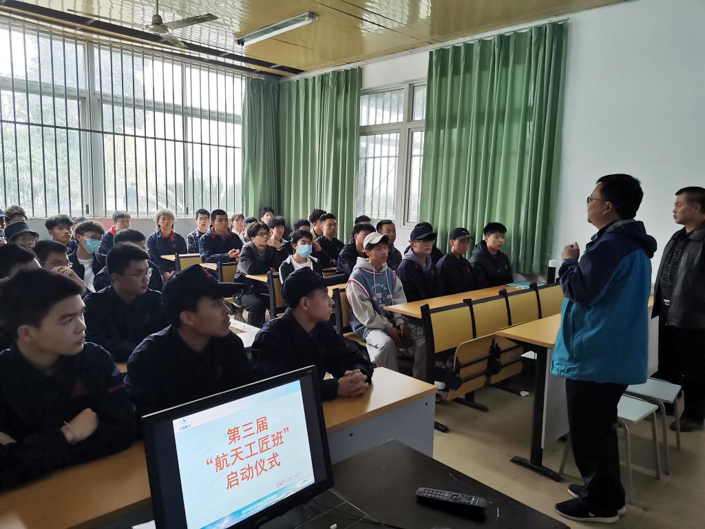 为提升拔尖人才培养水平,储备加工制造类竞赛参赛选手,近日,由飞行器制造系和实训教学部联合选拔的学院 “航天工匠班”在广汉校区举行了开班仪式。飞行器制造系主任、党支部书记周林,实训教学部部长罗清,相关教师及初选的30余名同学共同参加了开班仪式。