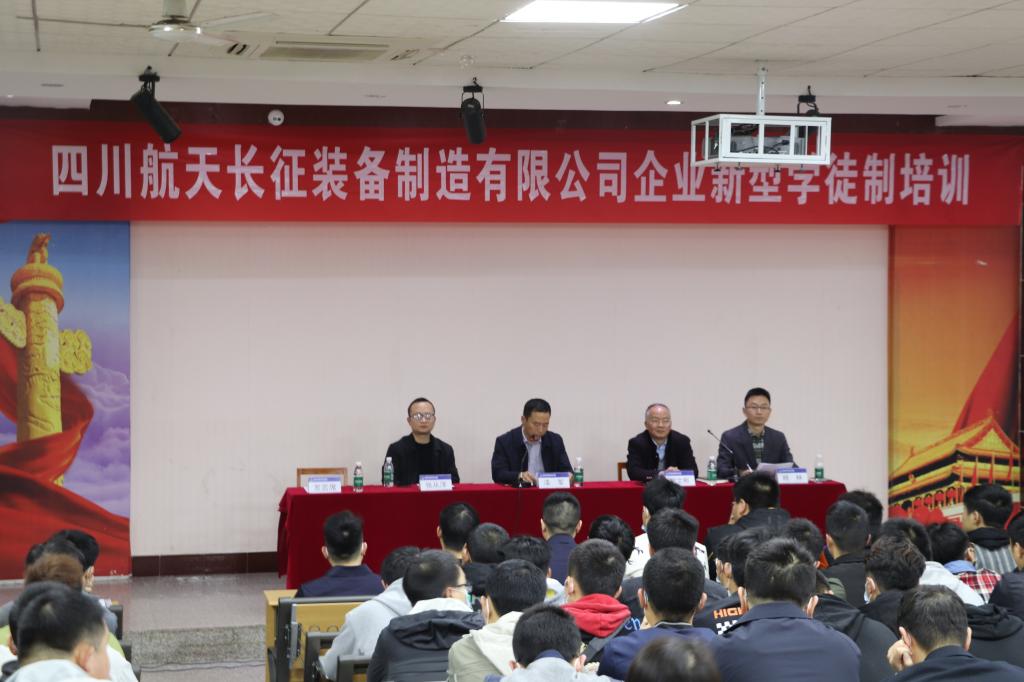 4月16日上午,四川航天长征制造装备有限公司与我校联合开展的新型学徒制开班仪式在我校正式启动。四川航天长征制造装备有限公司四川航天长征装备制造有限公司副总经济师兼人力资源处处长漆军、四川航天长征装备制造有限公司厂办公室主任张从洋,学院继续教育部部长胡文彬、副部长杨林等领导出席了开班仪式。 开班仪式由杨林主持。