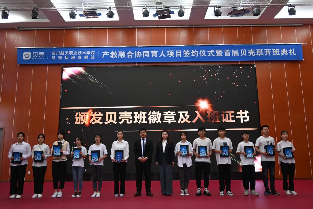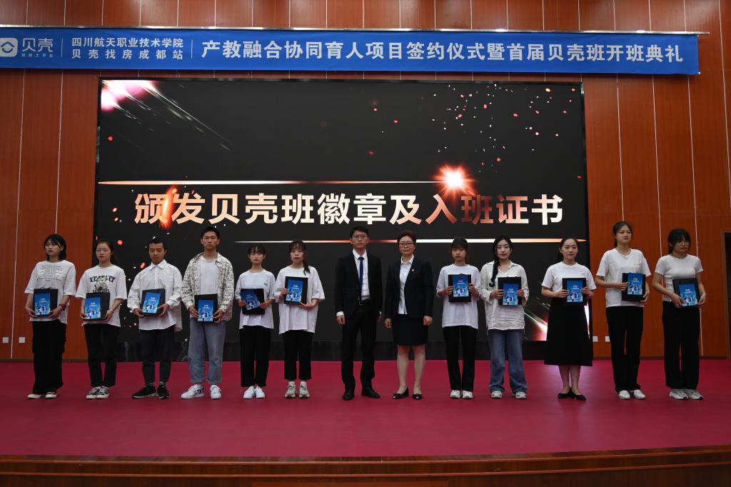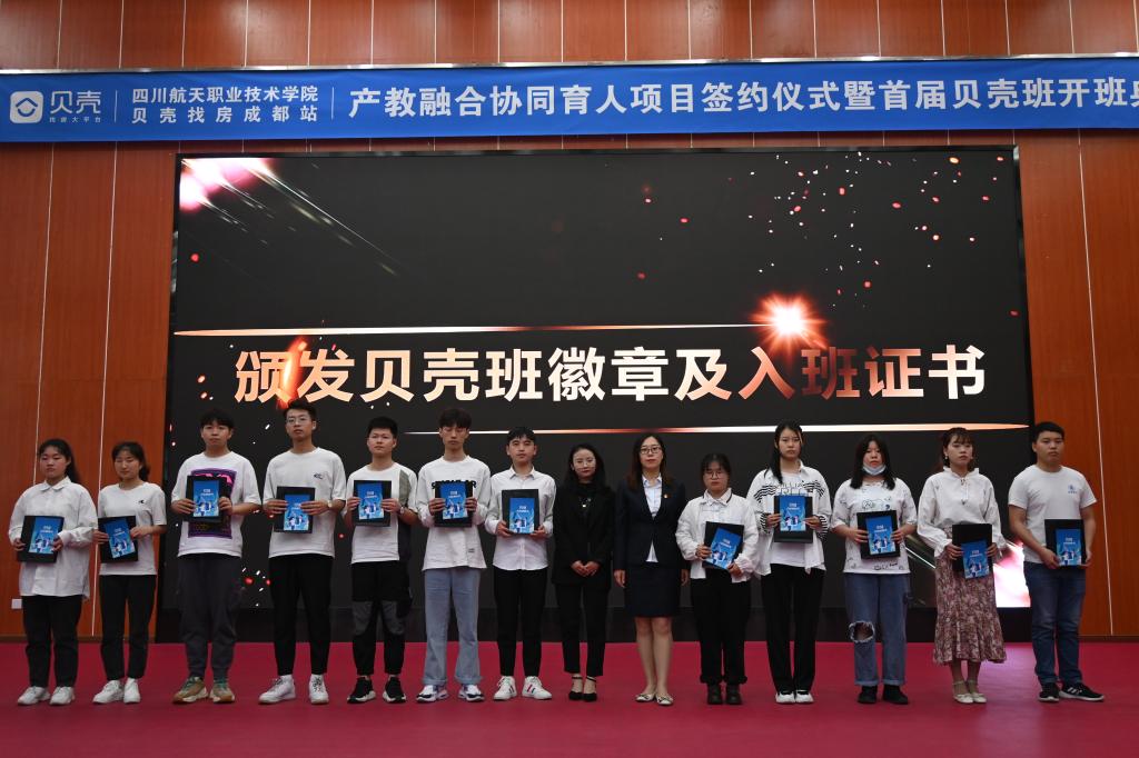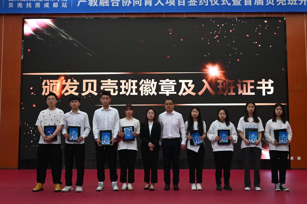 随后双方签约、授牌,学院副院长陈宇为企业授“校企合作生产实训基地”牌匾,成都贝壳闹海房地产公司蓉北事业部总监赵佳为学院授“校企合作人才培养基地”牌匾。仪式上,校企双方分别任命了学院高成老师和企业代表毛黎萍同志被任命为贝壳班班主任,毛黎萍宣导了贝壳班管理制度。最后各位领导向全体贝壳班的同学颁发徽章、入班证书及伴手礼。