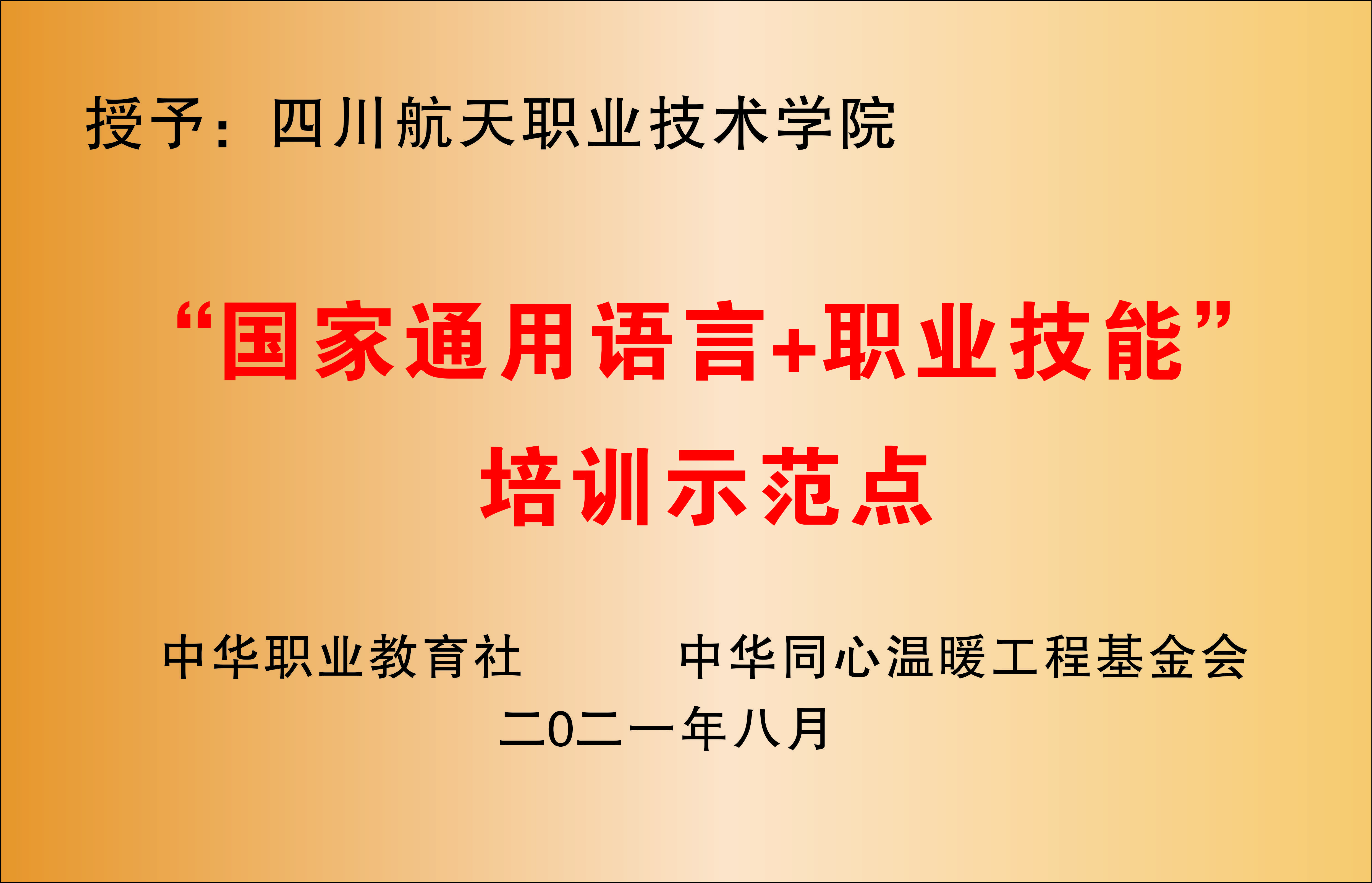 2021年8月,学院荣获中华职业教育社、中华同心温暖工程基金会“国家通用语言+职业技能”培训示范点称号。近年来,学院继续教育部坚持实事求是、因地制宜,积极接收马尔康市农民工到校进行焊接技术培训,派出师资到昭觉、华蓥、马尔康进行电工技术、电子商务、机械加工等方面的培训,参训学员达到355名。同时,学院大力支持并参与了德阳市中华职业教育社的工作。四川航天职业技术学院学术委员会主任刘家騑教授任德阳市中华职教社副主任,学院汽车工程系主任黄昌志教授任德阳市中华职教社理论研究专委会成员,多次承担了德阳市中华职教社理论研究课题并取得很好的成果,学院的办学实力及对外服务社会能力得到了社会的肯定认可。