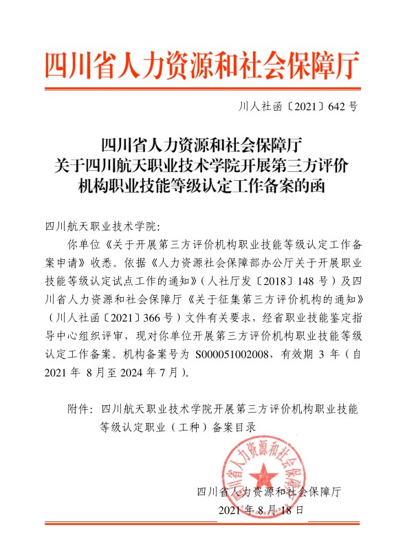 近日,经四川省人力资源和社会保障厅职业技能等级认定专家组评定,四川航天职业技术学院正式成为四川省开展职业技能等级认定第三方评价工作的首批高等院校,可面向社会开展车工、铣工、汽车维修工、汽车装调工、钳工、机床装调维修工、电工、广电和通信设备电子装接工、广电和通信设备调试工、计算机维修工、网络与信息安全管理员、物流服务师L、茶艺师等13个职业(工种)的职业技能等级认定工作。