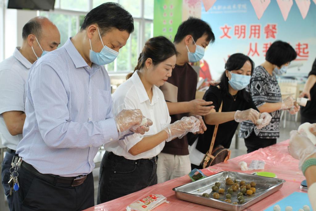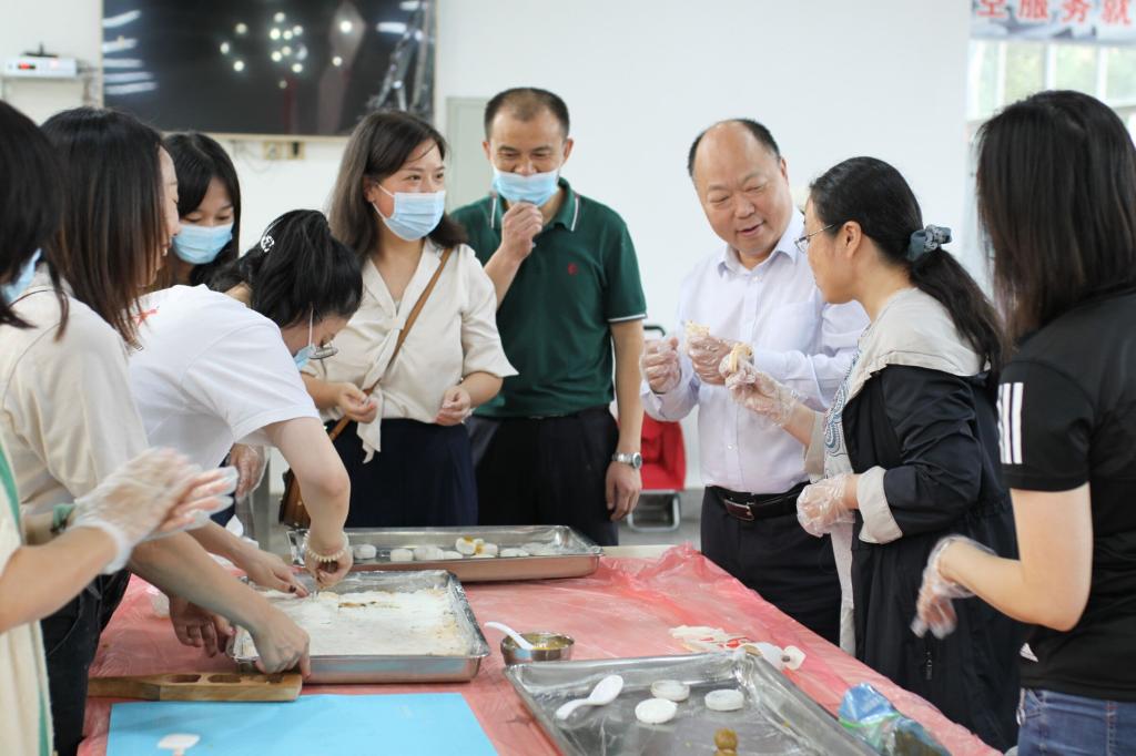 参加活动的老师和学生们大多数是第一次亲手制作甜品,每个人都兴趣盎然、跃跃欲试。在欢声笑语中,老师们开始做月饼、压模具、包糖纸,忙得不亦乐乎。大家互相分享着自己的制作小诀窍,场面热闹,气氛融洽,学院院长袁玫、党委书记李晓敏、副院级专务刘宏道,党委副书记、工会主席陈宇等领导亲临了活动现场,和师生们一起制作月饼,分享节日的快乐,并为师生们送上了中秋祝福。