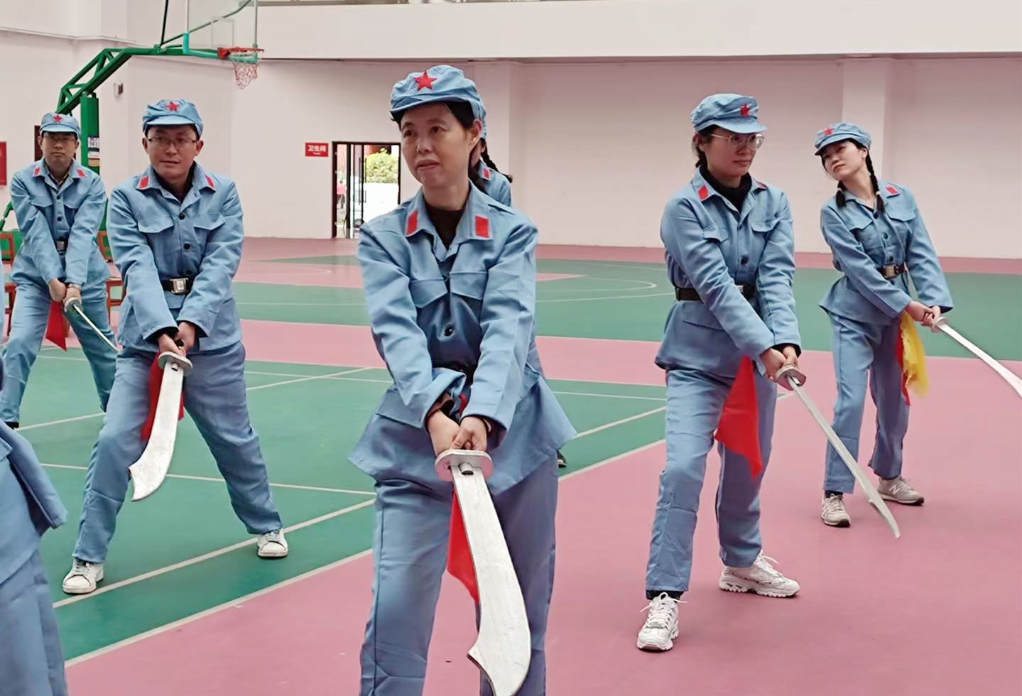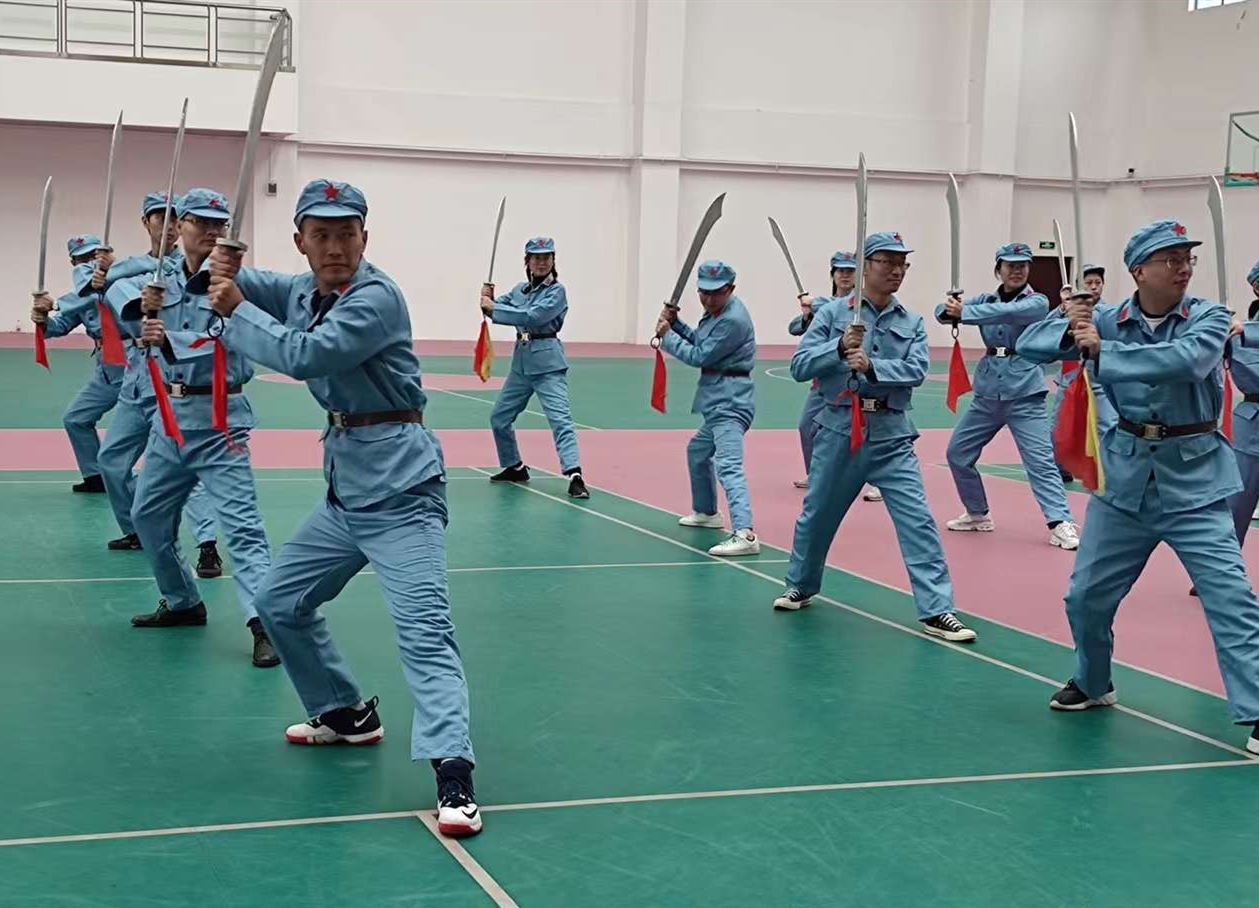 活动主要分为两个部分。大刀训练:通过“劈、砍、挡、撩、刺”几个动作的练习,配上“杀”的口号,全体党员共同感受在敌强我弱的局势之下,红军战士运用大刀长矛与敌人肉搏的战争场面;感受红军军纪严明、信念坚定、英勇杀敌的精神风貌。