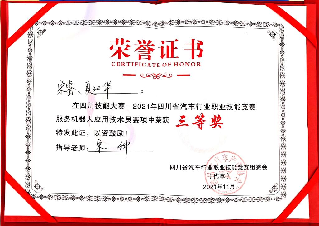 2021年11月1日,由四川省职业技能鉴定指导中心主办,四川交通职业技术学院承办的四川省职业技能大赛-2021服务机器人应用技术员赛项落下帷幕。大赛共有成都农业科技职业技术学院、四川交通技师学院、成都工贸职业技术学院、四川交通运输职业技术学院、四川信息职业技术学院、四川交通职业技术学院、四川航天职业技术学院等7所高校组织的11支队伍参赛。在此次比赛中,四川航天职业技术学院教师宋睿、夏江华组成的参赛队伍在激烈的比赛中荣获省三等奖的好成绩。