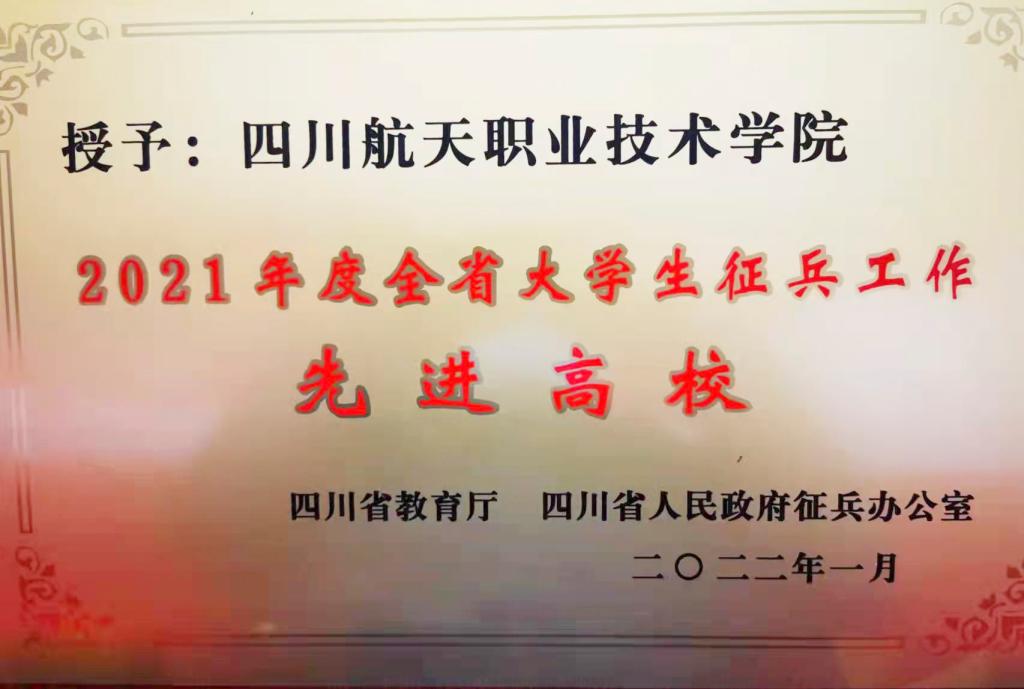 仪式上,四川省教育厅、四川省人民政府办公室对2021年度全省大学生征兵工作先进高校进行了通报表彰,授予四川航天职业技术学院“2021年度全省大学生征兵工作先进高校”。这是学院连续第三次获得该项荣誉,同时也是学院征兵负责人连续四年荣获省市年度征兵先进个人称号。