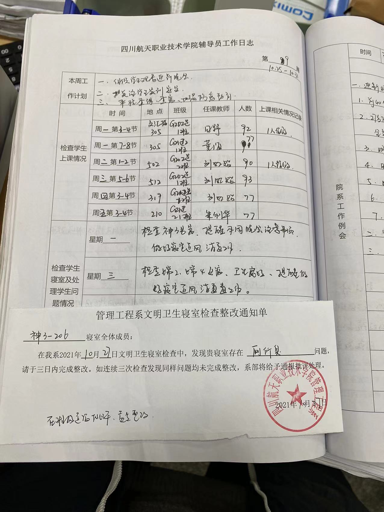此次检查成立了五个工作小组,分别对龙泉和三星堆校区进行检查。检查组通过抽查资料、实地考察、座谈等形式,对过去一学年中《辅导员工作日志》记录落实、辅导员值班查宿、学生日常考勤、班费开支情况及责任卫生区域整改等情况进行了检查,并对检查内容进行审核,对存在的问题和好的做法进行备注记录。本次检查目的重在为进一步加强在校大学生思想教育管理工作,强化辅导员工作责任意识,推进工作制度的有效落实,明确责任和权力,建立工作问责制度,促使辅导员工作规范化,制度化,对辅导员工作的改进和提高具有积极促进作用。
