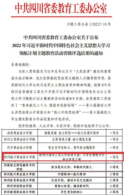 2022年11月9日,中共四川省委教育工委公布第六届全国高校大学生讲思政课公开课展示活动省级评选结果。在学院思政部涂朝志、刘鹓、王瑜三位老师精心指导的人文系周婷婷等同学录制的作品《新时代谱写三农工作奋进之曲 大学生唱响乡村振兴希望之歌》和邓彩莲、陈珍、王瑜老师指导管理工程系学生录制的《中国精神——航天精神》,经过学校推荐、大众评审、专家评审,从全省众多件作品中脱颖而出,分别荣获一等奖、二等奖。