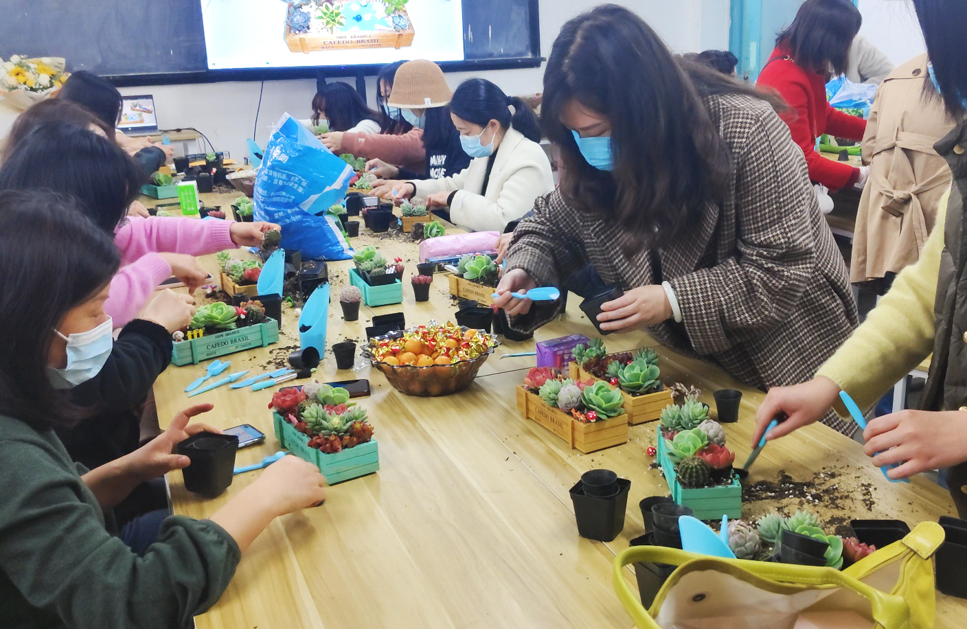 基础教学部分工会的女教职工们,也相聚在一起,围绕党的二十大、学院历史、生活小常识等开展了有奖问答,大家全情投入,你追我赶,不甘落后,现场气氛紧张激烈,团结和谐。无论是击鼓传花的即兴表演的小游戏、歌唱秀、诗歌朗诵,还是对家人的深情表白,不断地把活动推向了高潮。最后,全体女教师一起创作多肉盆栽,或清新、或可爱、或呆萌、或古典,现场顿时春意盎然。