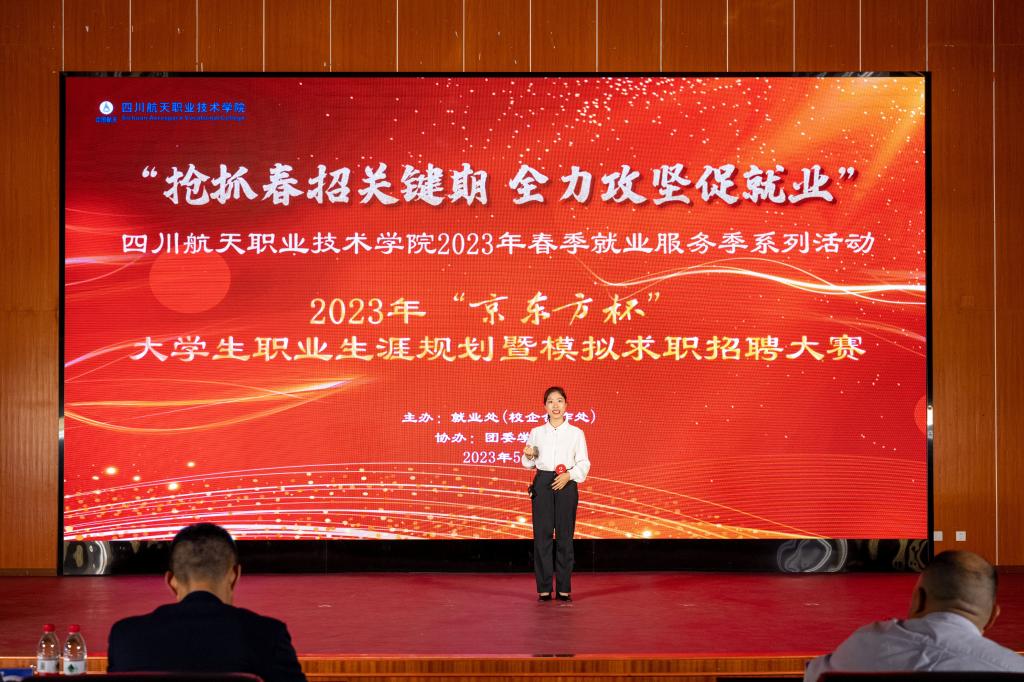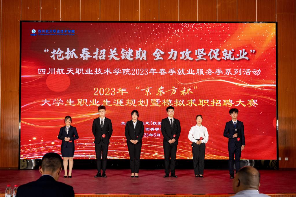 为普及大学生职业生涯规划知识,传播生涯成长理念,提高大学生的创新能力、实践能力和就业能力,激发大学生的目标感以及持续自我成长的动力,进一步强化学生就业观念,提升求职实战能力,实现更加充分更高质量就业,历时一个多月,经过系部初赛、校级复赛,最终共计12名选手通过层层选拔站上决赛舞台,上演最终精彩对决。近日,由就业处(校企合作处)主办,团委学工部协办的四川航天职业技术学院2023年“京东方杯”大学生职业生涯规划暨模拟求职招聘大赛校级选拔赛圆满举行。