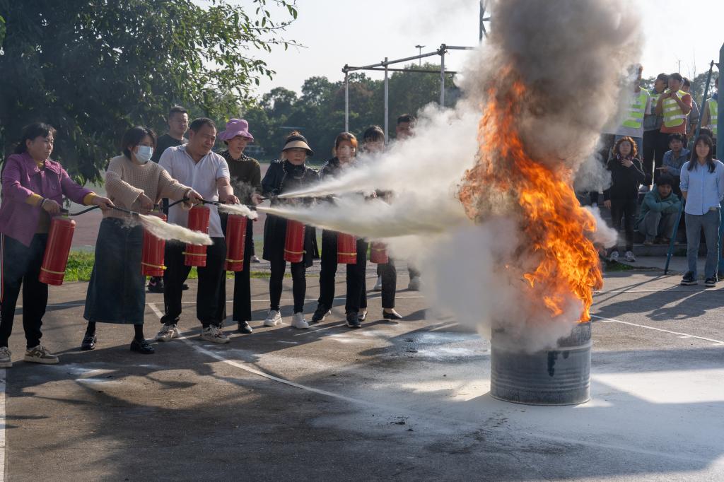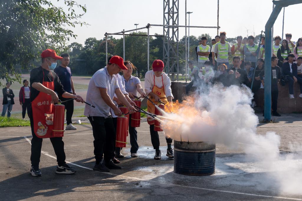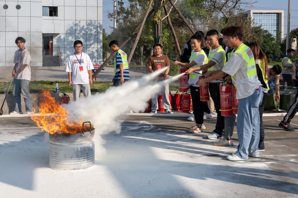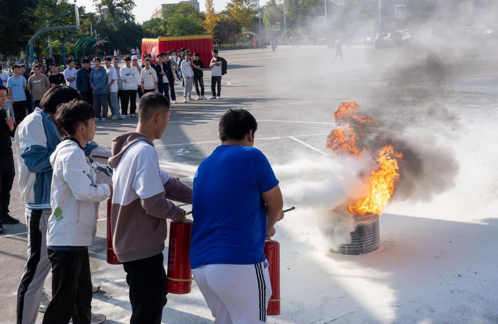 在模拟逃生体验环节,为更加真实的模拟火灾逃生环境,演练指挥部提前在模拟方舱内部投放了多个发烟装置,并组织演练师生分组通过浓烟密布、漆黑曲折的逃生通道,让大家对灾难逃生现场环境有了一个更加直观真切的感受。在灭火演练操作环节,学校消防安全管理人员首先为大家展示讲解了干粉灭火器的正确使用方法,接着学校师生代表、宿舍和食堂员工,先后操作灭火器进行了实战灭火演练。