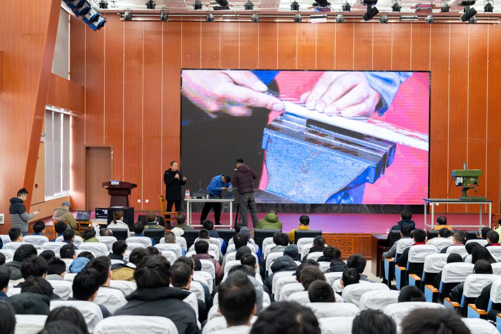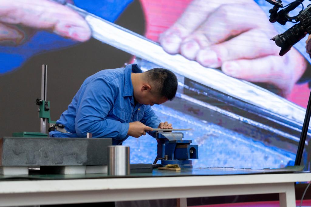 开幕式上,两名钳工技师在200名师生的注视下,现场秀绝活、展绝技。四川航天长征装备制造有限公司马宇,展示“水杯堵漏”的绝活,在15分钟内,测量漏洞尺寸,手工锉削堵漏块精确达微米,直到堵块和漏洞严丝合缝,并倒清水测试成功。