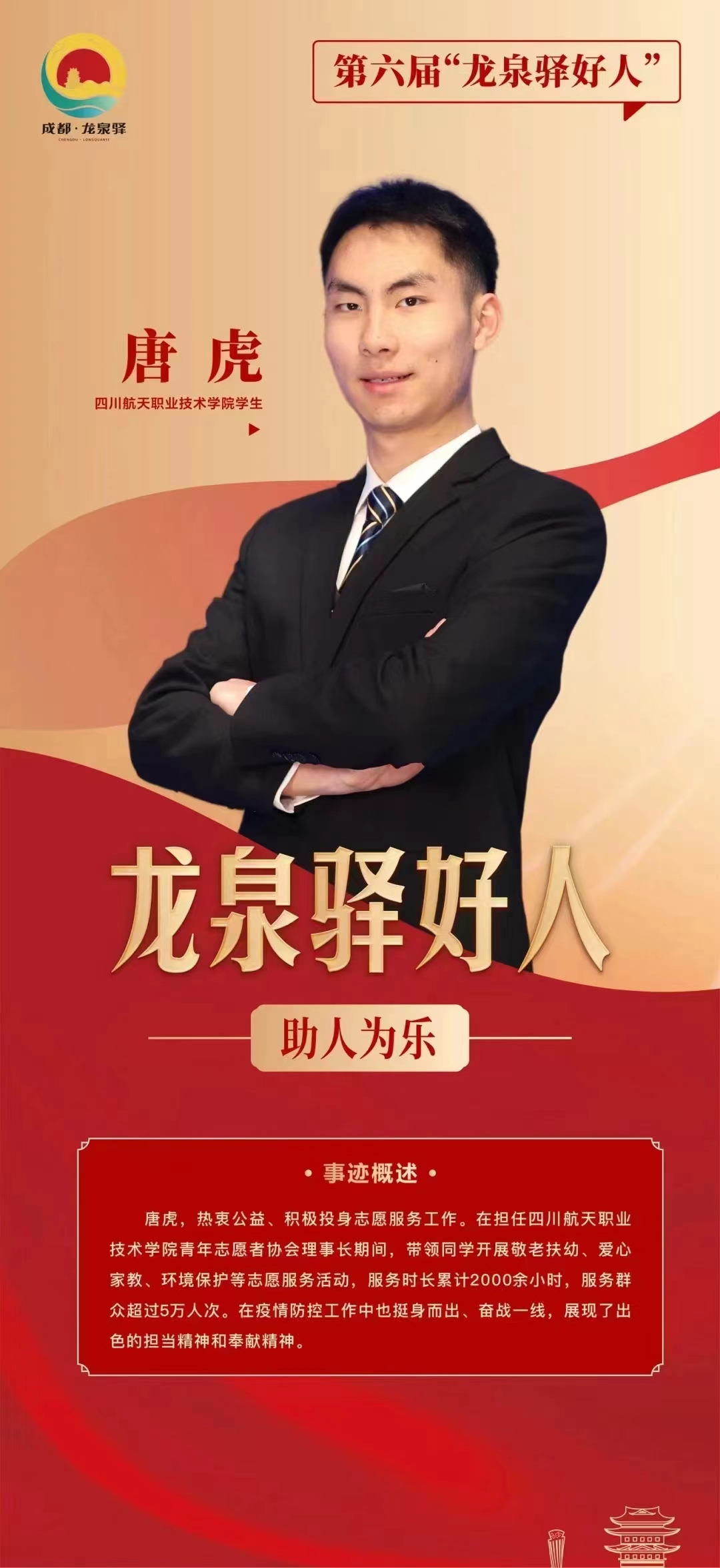 我校基础教学部学生唐虎凭借2000小时以上的高质量志愿服务,在成都市龙泉驿区第六届“龙泉驿好人”评选中脱颖而出,被评为龙泉驿区助人为乐“龙泉驿好人”。