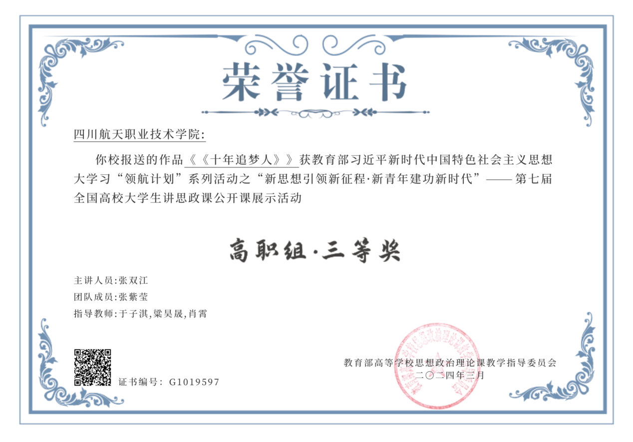近日,教育部公布了第七届全国高校大学生讲思政课公开课展示活动获奖名单,四川航天职业技术学院参赛作品《十年追梦人》荣获全国高职组三等奖。该作品由马克思主义学院教师于子淇、梁昊晟、肖霄指导,G22空乘3班张双江同学主讲。