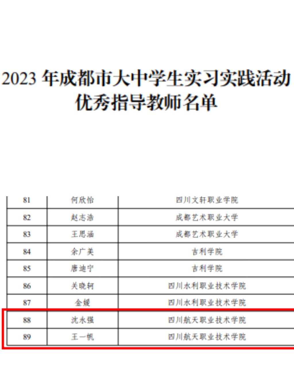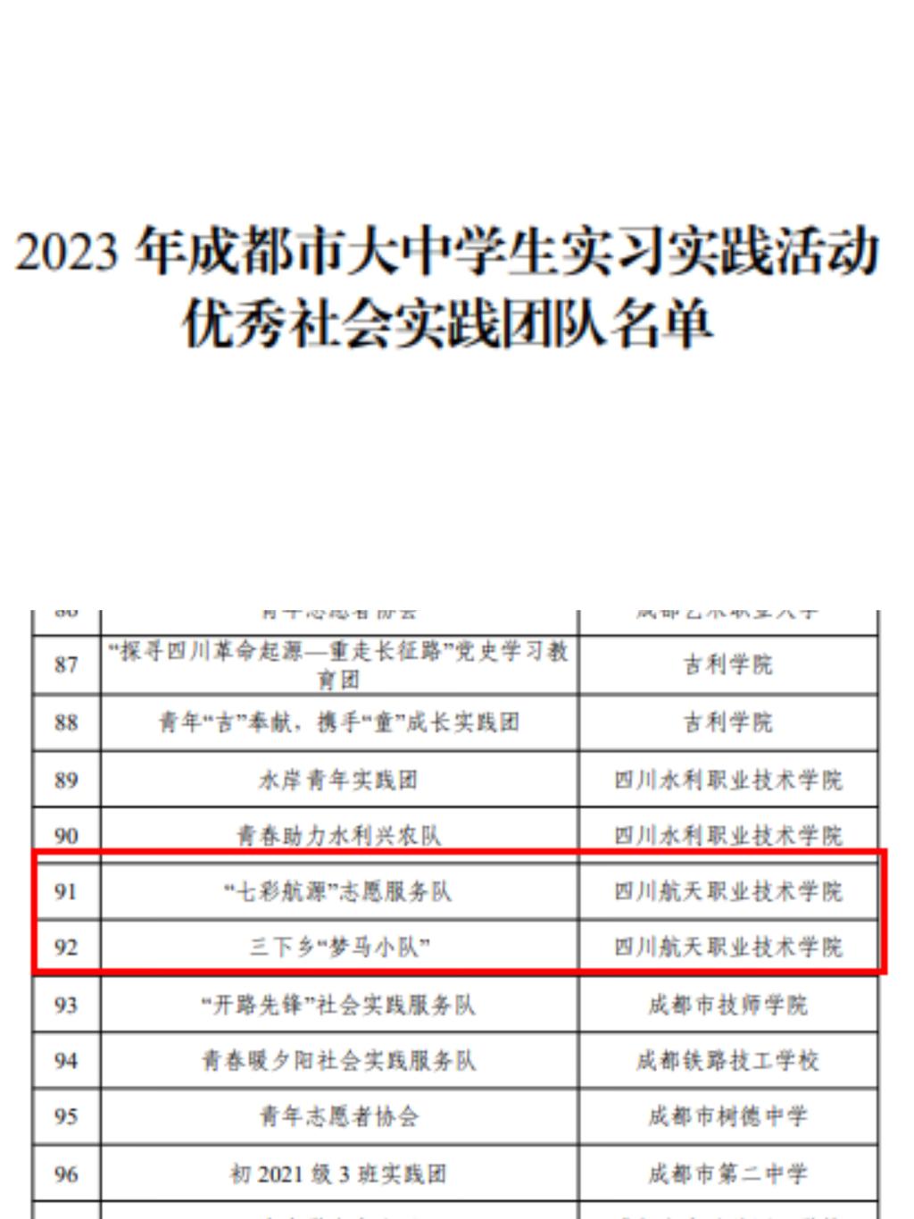 此次实践活动中,学校各二级学院响应号召,组建多支队伍积极参与,均取得良好成效,其中“七彩航源”志愿服务队、三下乡“梦马小队”荣获“2023 年成都市大中学生实习实践活动 优秀社会实践团队”称号,教师沈永强和王一帆荣获“2023 年成都市大中学生实习实践活动 优秀指导教师”称号。