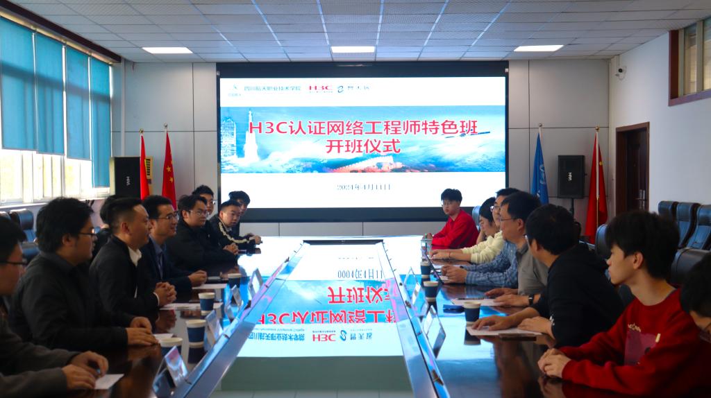 4月11日上午,在学校三星堆校区致远楼216会议室举行了“H3C认证网络工程师特色班”开班仪式。四川航天职业技术学院党委委员、副校长周林,四川智天远教育科技有限公司总经理张毅华出席活动。校企双方相关部门负责人及特色班全体学生参加了开班仪式。开班仪式由学校计算机学院副院长吴旭主持。