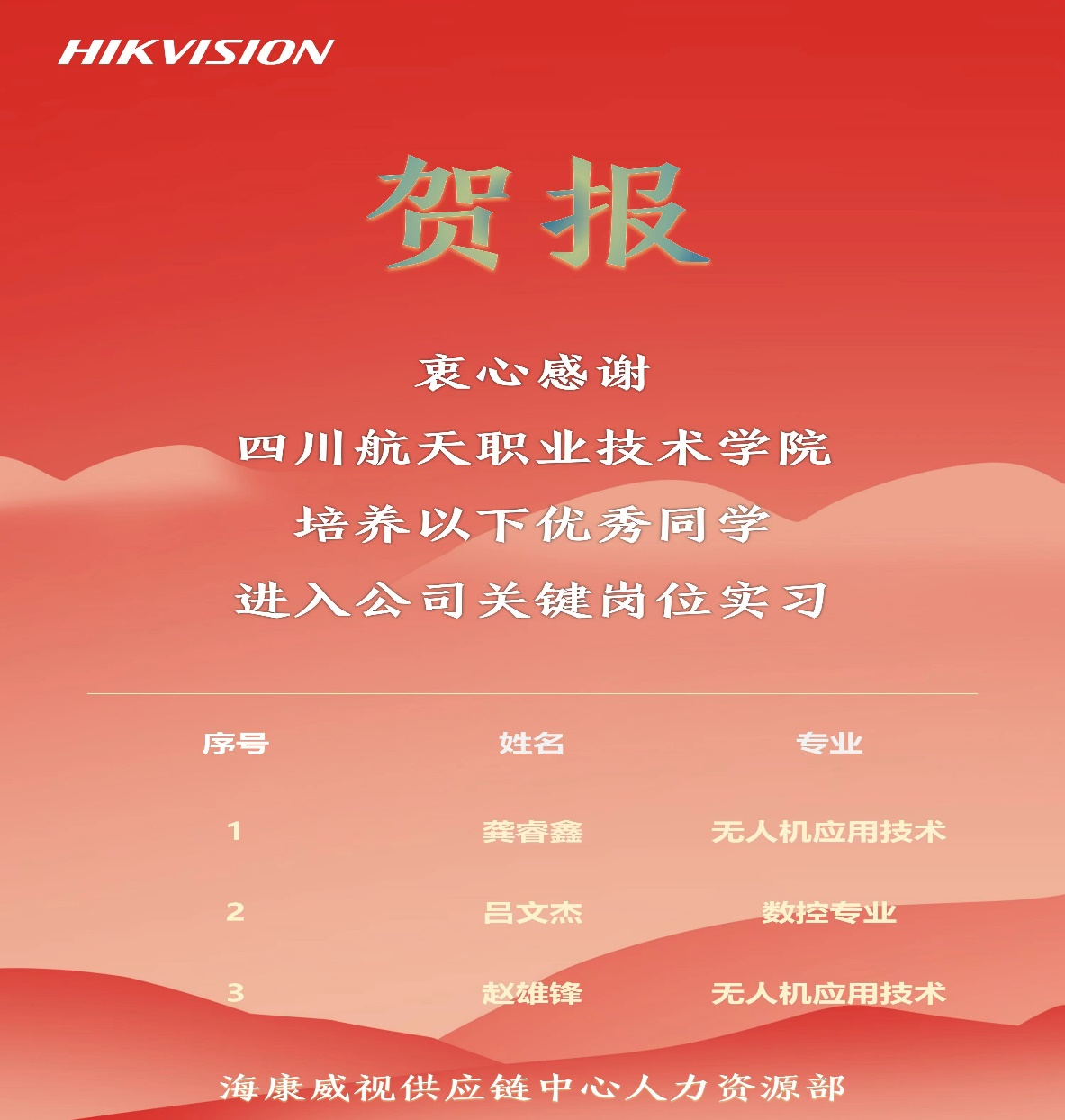 近期,从重庆海康威视科技有限公司获悉,学校2024届三位优秀毕业生获得公司关键岗位offer。学校自2021年与物联网头部企业海康威视公司校企联合育人以来,先后建立了三期海康威视薪火订单班。累计为企业输送优秀毕业生100余名。