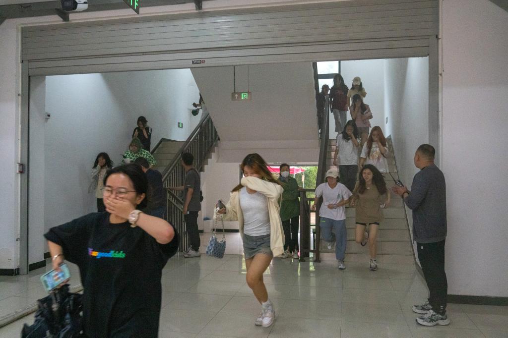 下午1:40分,随着声声警笛响起,迎着阵阵浓烟,三星堆校区应急疏散演练正式拉开帷幕,参演师生按照学校应急预案规划路线,在楼层疏散引导员的正确指挥下,师生们捂住口鼻,弯腰贴墙按照指定路线开始有序从寝室向预定集结地进行疏散,从开始到疏散完成仅用时3分钟,学校“5.12”应急疏散演练取得了圆满成功。